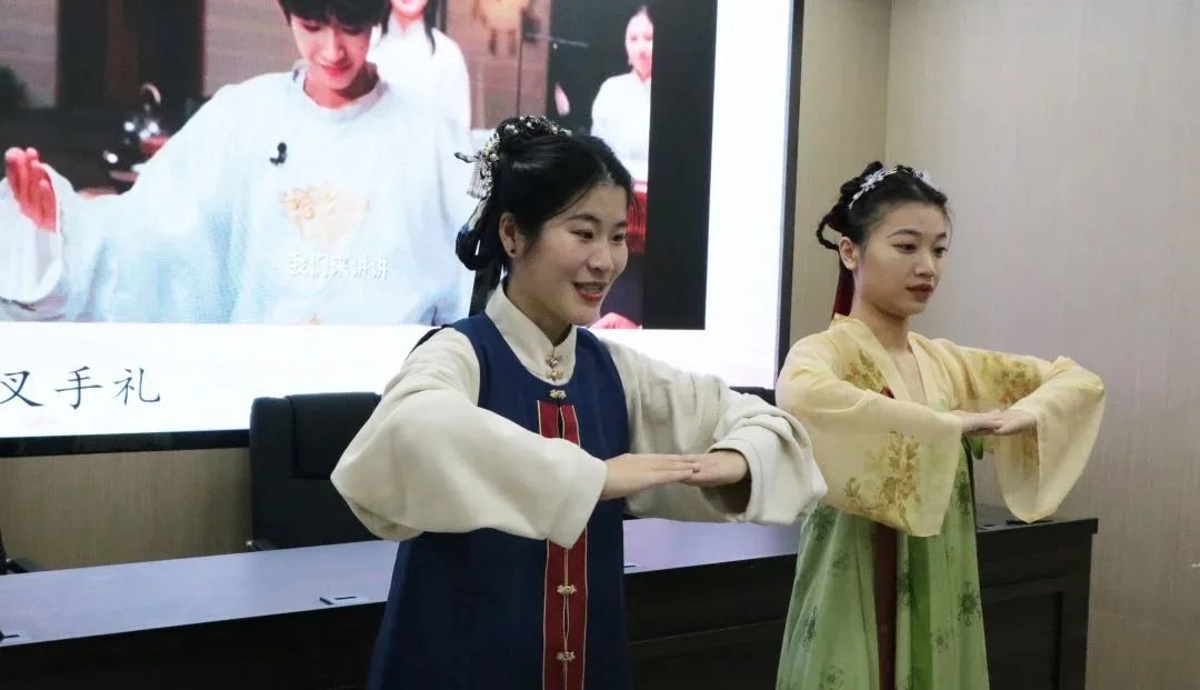 “左手握住右手大拇指,左手小指指向右手腕……双手放在胸前,微微向前推出,慢慢鞠躬……”志愿者苗清蕾正带领双庙村的小朋友们一同做出叉手礼的姿势。西晋时人们日常问候的方式被大学生志愿者与社区儿童悉心重现,串联起千年后中华儿女的雅蕴情丝。