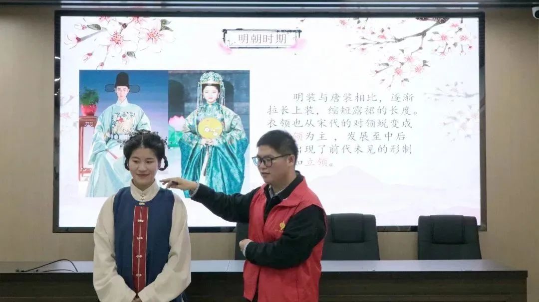 精致的步摇随风摇曳,靛蓝色发带垂落成一个温婉的弧度。只见志愿者范媛媛身着明朝衣装,向社区的孩子们介绍传统汉族服饰。“服章之美谓之华,礼仪之大谓之夏。唐朝鲜艳,宋朝典雅,明朝华贵,服饰作为一种文化的形态,见证了中华民族各个时期历史的变迁、经济的发展和审美意识的演变。”范媛媛从传统服饰的制式特点讲起,追溯到相关礼仪和文化背景,并带领小朋友们重点学习模仿了叉手礼、万福礼两种行礼方式。