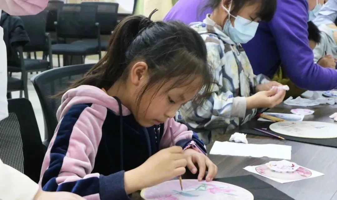 粘贴扇柄和扇面,填色、加水、晕染……在志愿者陆宇云耐心的指导下,小朋友们正用心地制作团扇。志愿者老师以一段动人的团扇舞蹈引入,让孩子们在美的情境中学习知识,在理论与实践的结合中加深对传统工艺品的理解。一把把团扇成品绘着古代花鸟画的图案,有的淡雅,有的瑰丽,象征着团圆与吉祥,凝聚着小朋友们的心意,正呼应了先前所学不同朝代服饰的特点,学以致用,妙趣横生。