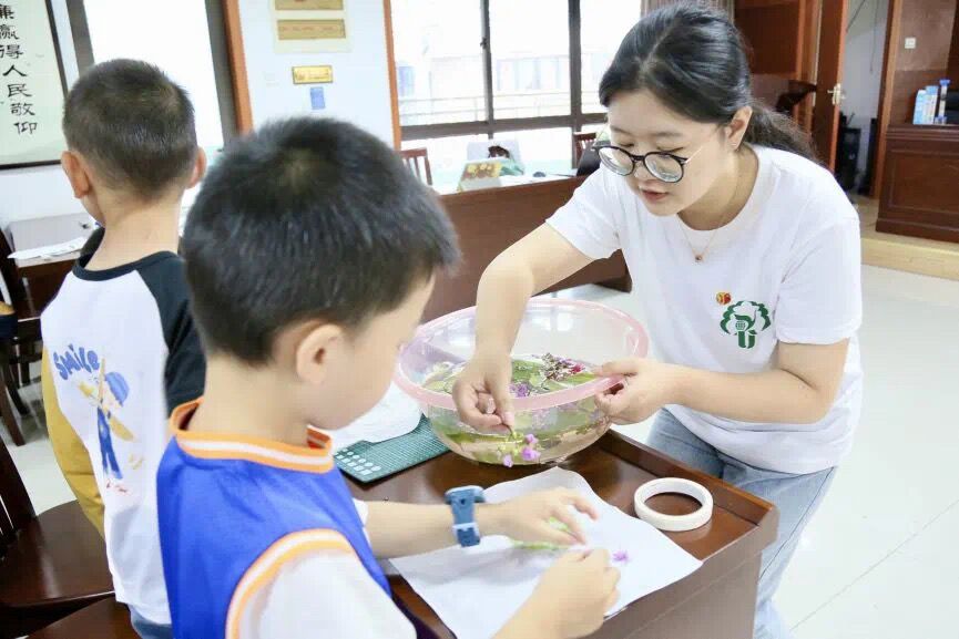 课堂上,孩子们还体验了植物拓染,通过简单的生物学原理,让布料吸收植物染液形成不同的图案。