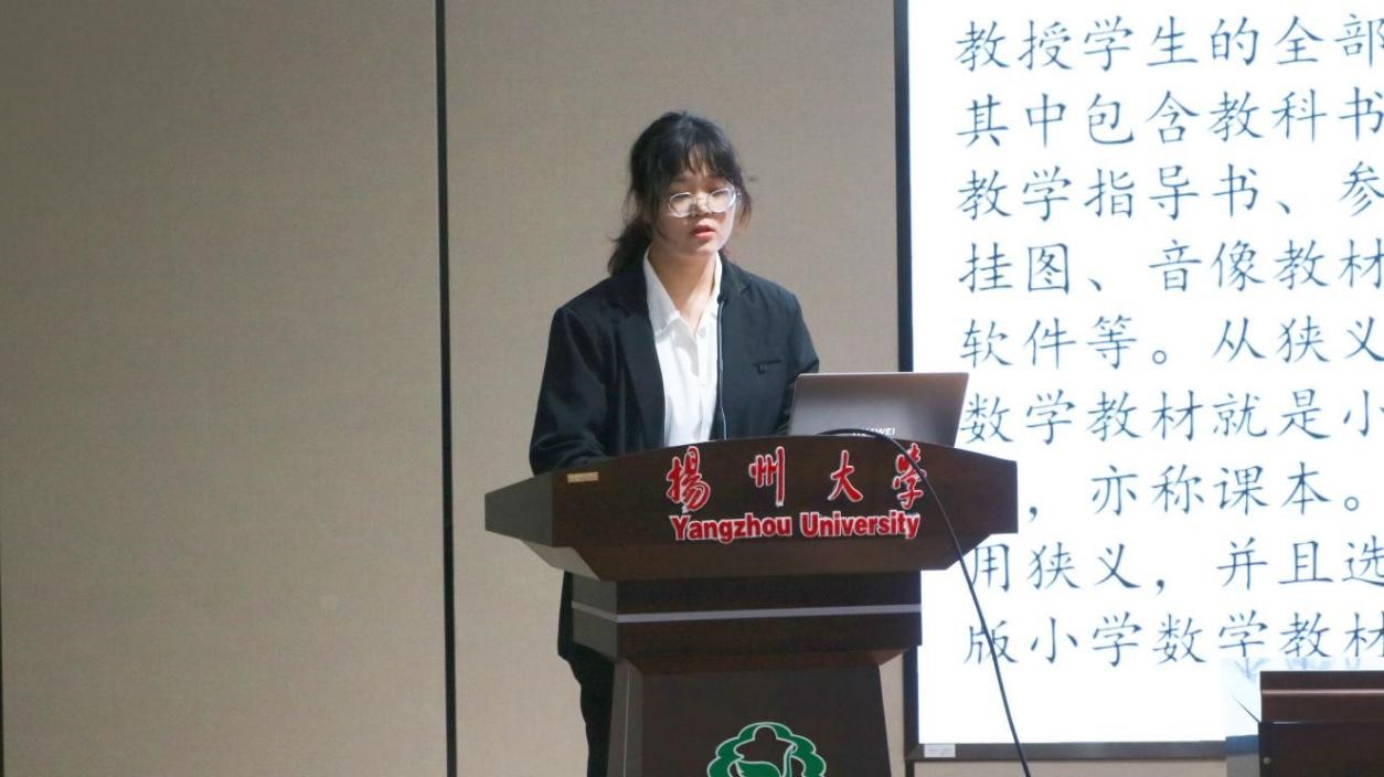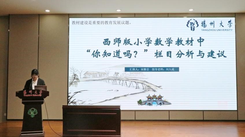 宋雅芸同学首先介绍了选题缘由与研究意义,通过对西南师大出版社出版的小学数学教材中“你知道吗?”栏目进行深入的剖析,她期望能为一线教师的教学提供参考,以及为我国的数学文化研究提供丰富的理论依据和资源。基于此,宋雅芸同学详细讲解了自己的“研究内容与研究思路”,提出三点教材优化的思考和建议:依据不同学段特点,适当调整栏目的数量和要求;促进数学文化与教学内容的深度融合;查漏补缺,用全面独到的眼光选材。最后宋雅芸同学从实践上反思了自己在此研究中存在的不足,依此谈及了自己的三点展望。