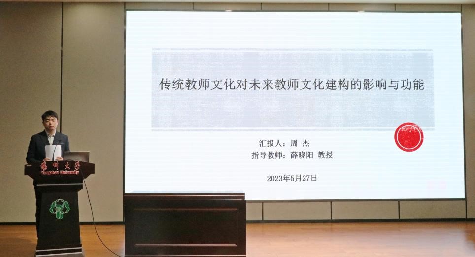 中国传统教师文化作为一种文化特质,周杰同学从“君子”的教育人格、“重义轻利”的教育价值以及教而“传道”的教育责任三个维度建构起传统教师文化的特质与内涵,探究了中西方教师文化及传统在师生关系、知识构成以及教育功能三方面存在着巨大差异以及特质与优势。最后,周杰同学谈到,中国传统教师文化是未来教师文化专业建构的基础和前提,必须继承和总结中国传统教师文化的优势与不足,同时又要汲取西方教师文化的积极因素,这对于未来教师文化的专业建构具有战略指导作用。