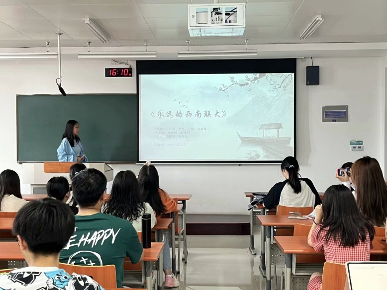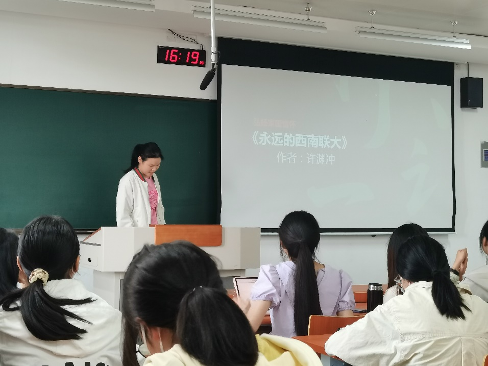 本次读书分享会以小组的形式进行汇报展示,六个小组的汇报人先后上台发言,对两本书中的精华内容进行阐释和交流。前五组选择分享的是《永远的西南联大》,第六组选择的是《陶行知文集》。同学们在台下认真聆听,并及时做记录。