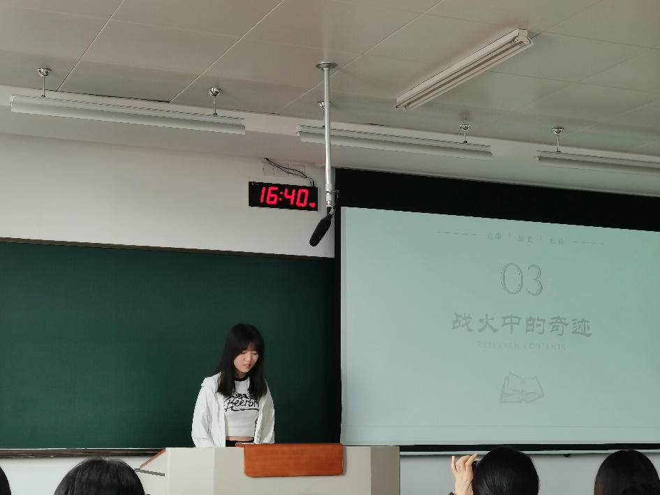 第二组顾旭逸和潘丽娜重点讲述了许渊冲老师在书中娓娓道来的关于西南联大人最真实的求学经历和最质朴的心路历程。一件件日常小事,无不透露出他对于生活的热爱,对友谊的珍重以及对爱情的真诚。“只问敢勇,无问西东”,希望大家能向西南联大的前辈们学习,不畏艰难,勇往直前!