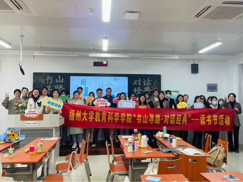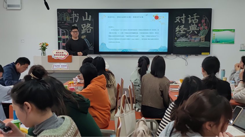 博求万物之理,以尊闻而行知。为营造良好的校园文化氛围,扬州大学教育科学学院(师范学院)(学前教育学院)于2023年4月22日上午8:30在瘦西湖校区8号楼S108举办“书山寻路,对话经典”——读书节活动(第二期)。本期阅读书目为《陶行知教育文集》。活动采取读书沙龙形式,通过研讨、交流、提问、答疑等环节,分享爱书人的阅读心得、展现各专业的学术风采,提升教科院师生的审美情趣和人文底蕴。