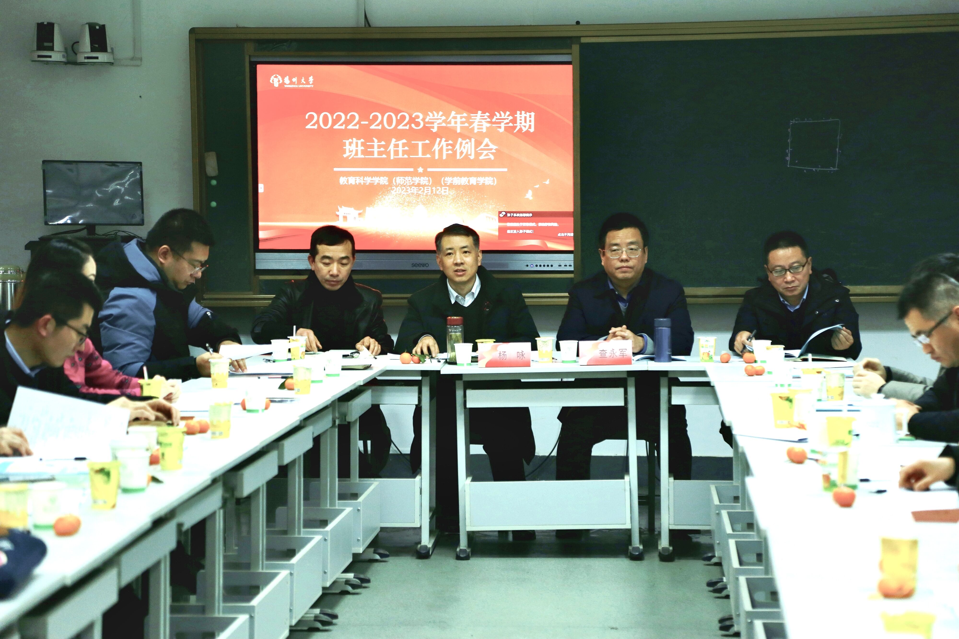 新年伊始,万象更新。2023年是全面贯彻落实党的二十大精神的开局之年,也是落实教育事业“十四五”规划的关键之年。为确保新学期教育教学工作的有序开展,进一步增强班级管理工作的针对性和实效性,2月12日下午,扬州大学教育科学学院(师范学院)(学前教育学院)顺利召开2023年春季新学期班主任工作例会,院党委书记杨咏、院长查永军、党委副书记朱鑫铨、副院长刘牧、团委书记孙维、全体班主任老师及全体辅导员参与了此次会议。