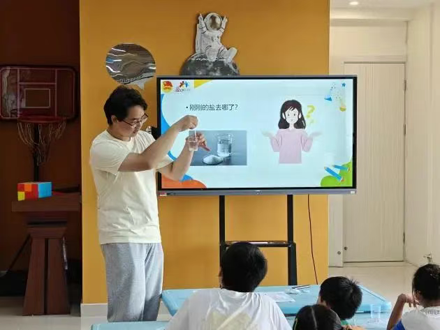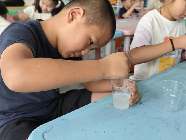 活动伊始,志愿者何星宇以“感冒”这一话题引入,打开了固体溶解的科学大门,这一亲切的话题迅速点燃了孩子们的热情,也激发了孩子们对于溶解现象的思考。“盐放进水里不见了,它真的消失了吗?怎么证明它还在水里?”这个看似简单的问题,如同一把钥匙,打开了孩子们探索科学世界的好奇心之门。孩子们踊跃发言,分享着生活中糖、洗衣粉等溶解的例子,课堂气氛热烈而活跃。