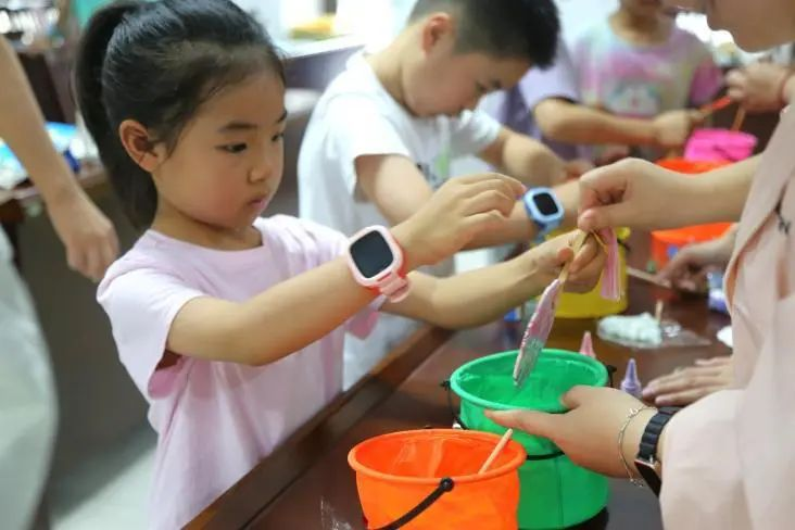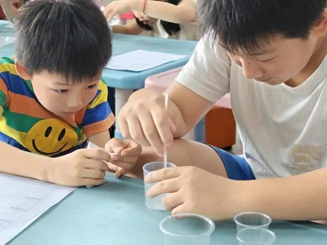 科普课堂的高潮是动手实践环节。孩子们分组合作,化身实验小达人。在配制饱和溶液环节,孩子们兴奋又小心的将食盐一点点的加入水中,并不断地搅拌,志愿者们也在一旁为孩子们做指导。水饱和之后,孩子们纷纷惊叹道:“盐居然不溶于水了!”“这一定是魔法!”他们兴奋地在志愿者们的指导下将棉线放在溶液中,并通过志愿者所教授的“控制变量法”将溶液分别置于温暖处和阴凉处,比较不同温度下晶体析出的快慢。