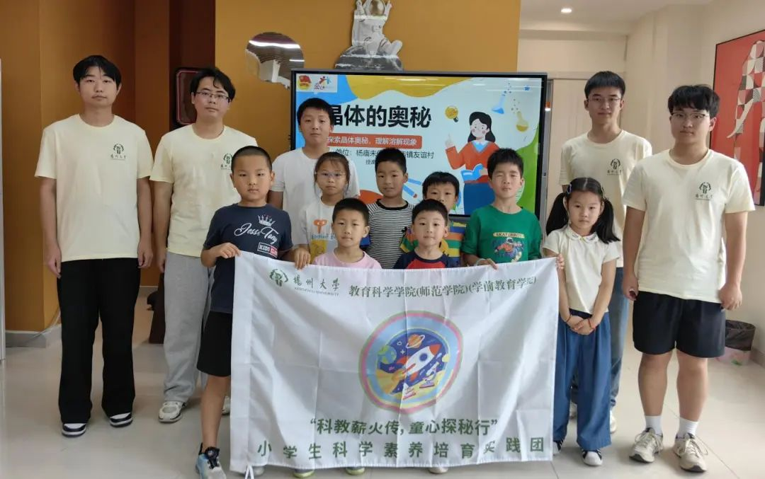 近日,我院“教科星火传,童心探秘行”小学生科学素养培育实践团队走进扬州市邗江区友谊村,开展了一场别开生面的科学素养培育活动。此次活动旨在提孩子们的科学素养,带领孩子们探索科学的奥秘,激发其对生活中的科学现象的兴趣和探索意识。课堂中,孩子们化身小小科学家,开启了一场探索物质溶解与晶体形成的奇妙旅程,亲身感受了科学世界的魅力与严谨。