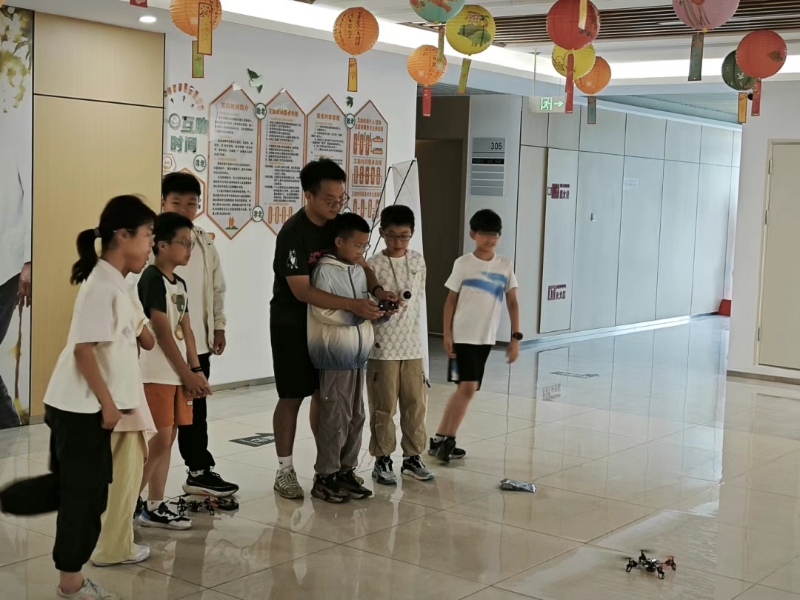 在无人机体验环节中,曹瀚林操控飞行器在空中摆出环形轨迹,还操控无人机悬停在半空中抛洒彩色贴纸,孩子们踮脚争抢的模样将现场火热的气氛推向了高潮。志愿者们分成小组,手把手教孩子们练习模拟器操作,帮他们调整握杆力度。当有孩子因操作失误难过地瘪起嘴角时,志愿者蹲下身展示自己练习时撞歪的螺旋桨,安慰道:“你看,哥哥也是练了好多次才学会的。”
