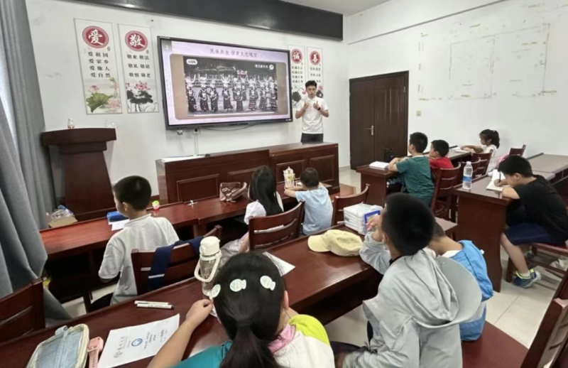 活动伊始,陪教团成员借助相关图片和视频,向孩子们简要介绍三穗县的地理位置、文化习俗和自然景观。加榜梯田、云台山、侗族大歌、酸汤鱼……贵州独特的自然环境造就了当地秀丽的山水景观和独特的少数民族风情,苏黔两地的文化差异也引发了孩子们的好奇心与分享欲。“吊脚楼好漂亮啊,设计也很精巧。”“折耳根到底是什么味道呢?”在一声声感叹和疑问中,小朋友们的思绪也随之飘向那片民族文化与山水交融的远方。