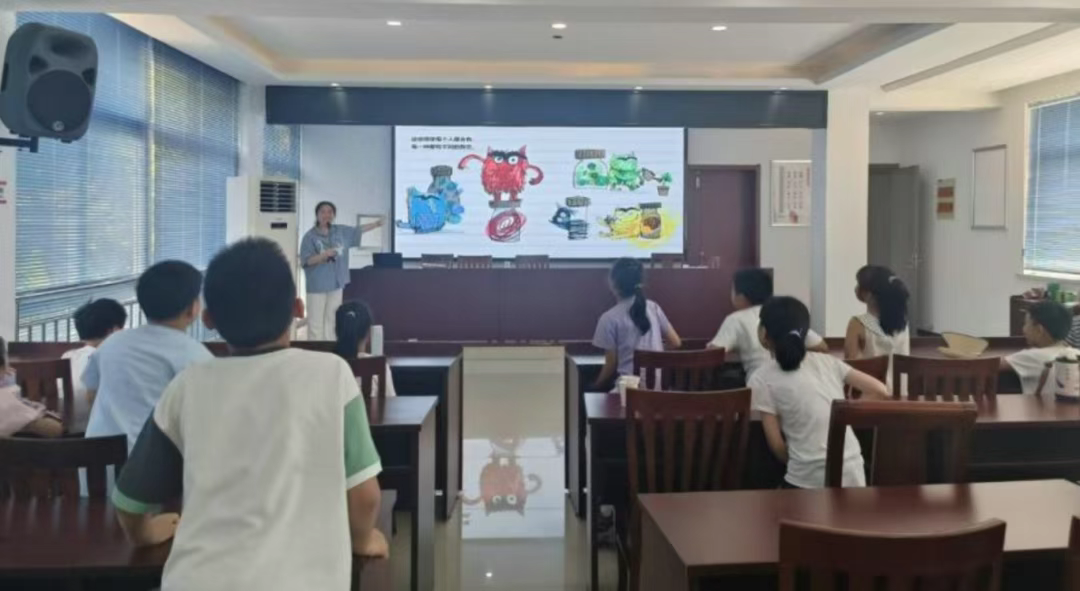 绘本阅读环节,志愿者侯雨萱利用生动的PPT,带领孩子们走进《我的情绪小怪兽》绘本世界。绘本将情绪与色彩相结合,借助情绪小怪兽的视角让孩子们认识情绪,大家仿佛亲历了一场心灵的旅程。