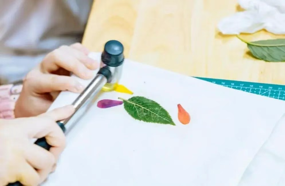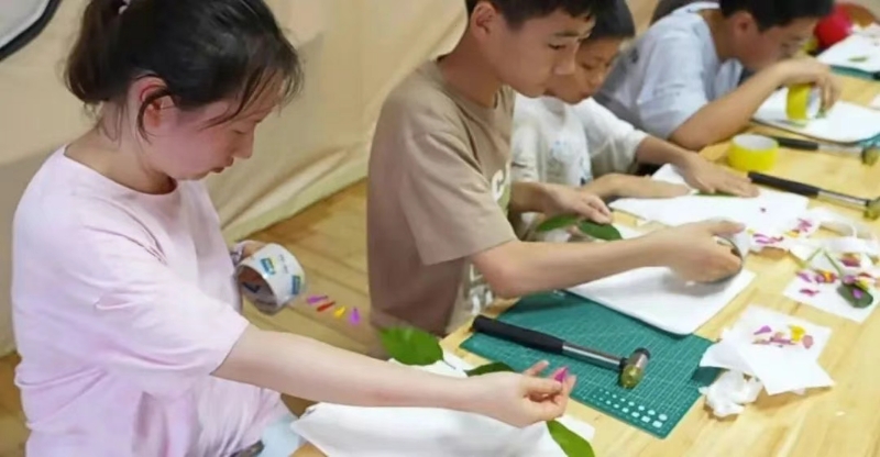 植物拓印环节的节奏则舒缓许多。孩子们将荷花、扁豆花、凌霄花等在帆布包上摆成图案,握着小锤轻轻敲打。林浩宇在自己采的荷叶上涂上绿色颜料,将其覆盖在帆布包上,捶打间荷叶的纹理印在布面上,形成独特的花纹。“这是我和荷塘的秘密印章”,他对志愿者老师说道。
