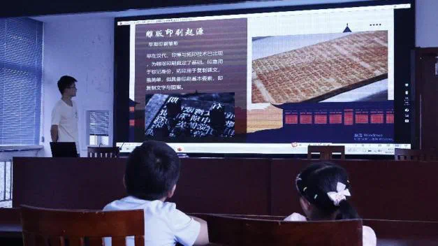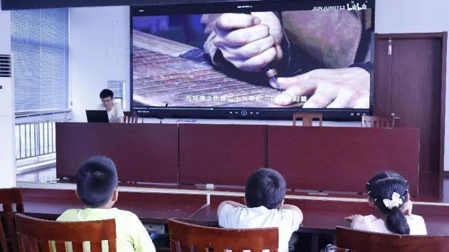 志愿者陆旭播放了一段专门讲述雕版印刷历史的视频,视频呈现敦煌藏经洞《金刚经》雕版特写,0.2毫米刻痕引起学生惊叹。当画面出现工匠汗滴落在梨木板上的特写时,孩子们目不转睛,被穿越千年的工匠精神所深深震撼。当画面给到非遗传承人邓清之的时候,传承的力量与匠心的不易更是感动了在场的每一个孩子。