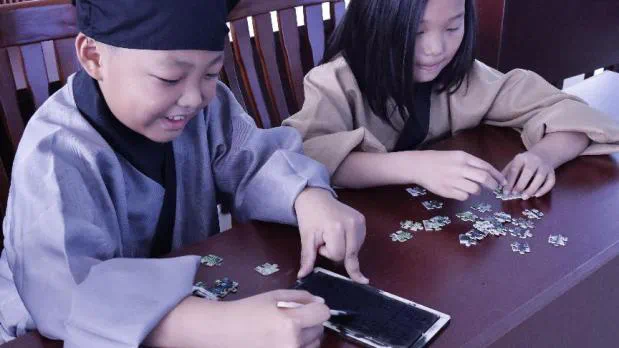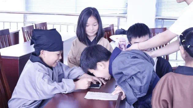 此时,先前退场的志愿者陆旭身着演出服装再次回到课堂现场,带着孩子们以角色扮演的方式重现了毕昇发明活字印刷术的历史情境。在情景剧中,孩子们扮演刻工,面对缓慢的工作效率与监工的打压,想出了用活字排版的方式来印刷的方法。这场叫做“泥火生字”的微剧场将孩子们带入了那段尘封的历史,将非遗文化的厚重与匠心传承的责任自然渗透到孩子们的心中。
