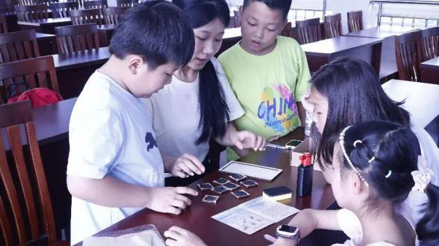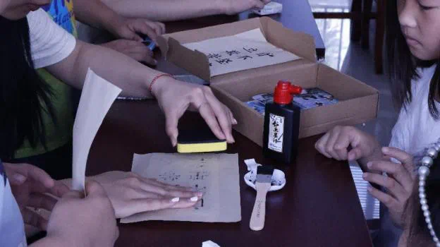 成功调动起了孩子们的兴趣之后,团队成员们取出准备好的工具,与孩子们一同亲手刷印,零距离触摸古老技艺的温度与智慧。松烟墨香氤氲开来,将刻好的活字置入版中之后,蘸墨的刷子先在瓷盘边缘刮过三下——这是刚学的“三匀法”——待墨汁在鬃毛间均匀晕开,才悬腕扫向雕版。第一刷墨色太浅,“亭”字右半若隐若现;第二刷又因用力过猛洇出墨团。当第三次提腕时,棕刷轻抚版面,墨汁精准填满笔划凹槽。孩子们屏息按住宣纸,棕刷扫过木雕版的刹那,《兰亭序》的墨迹便渐次显现。“王羲之的字活过来了!”孩子们纷纷抬头向指导的志愿者陈怡萍求证:“唐朝人也是这样拓字的吗?”她讲解道:“没错,唐代匠人刻这类细笔需换三把刀,一天可能只能刻下50个字。”看着自己亲手刷印出的墨字,孩子们的脸上露出了灿烂的笑容。