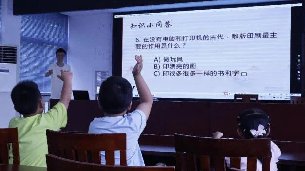 “在没有电脑和打印机的古代,雕版印刷的主要作用是什么?”许庄小学的孩子们争先恐后地举起双手回应志愿者陆旭的问题,“为了印很多一样的书和字!”现场洋溢着热情的气氛,教院学子们带来的这堂“非遗文化情境德育课堂”开课了。
