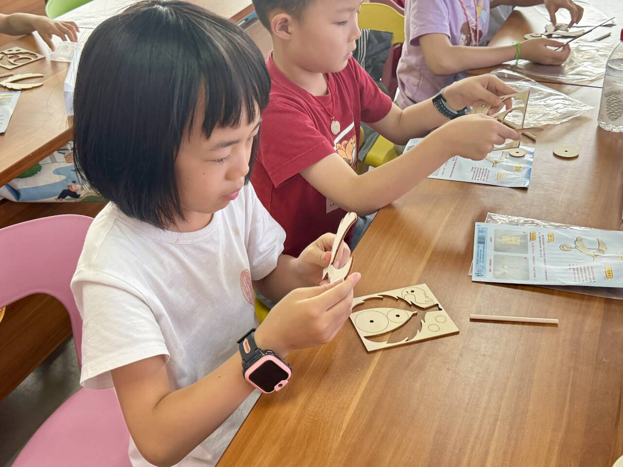 第二组小朋友的手工活动是制作平衡鸟。志愿者范竞遥提前备好材料,耐心示范折法,手把手教小朋友调整鸟身重心,用通俗语言讲解平衡原理。孩子们专注投入,时而皱眉调整,时而欢呼成功,现场笑声不断。“我的小鸟能站在指尖啦!”小朋友们举着作品,雀跃的向范竞遥分享。活动不仅让孩子们在动手中领悟科学奥秘,更在志愿者的陪伴下收获了探索的快乐与成就感。