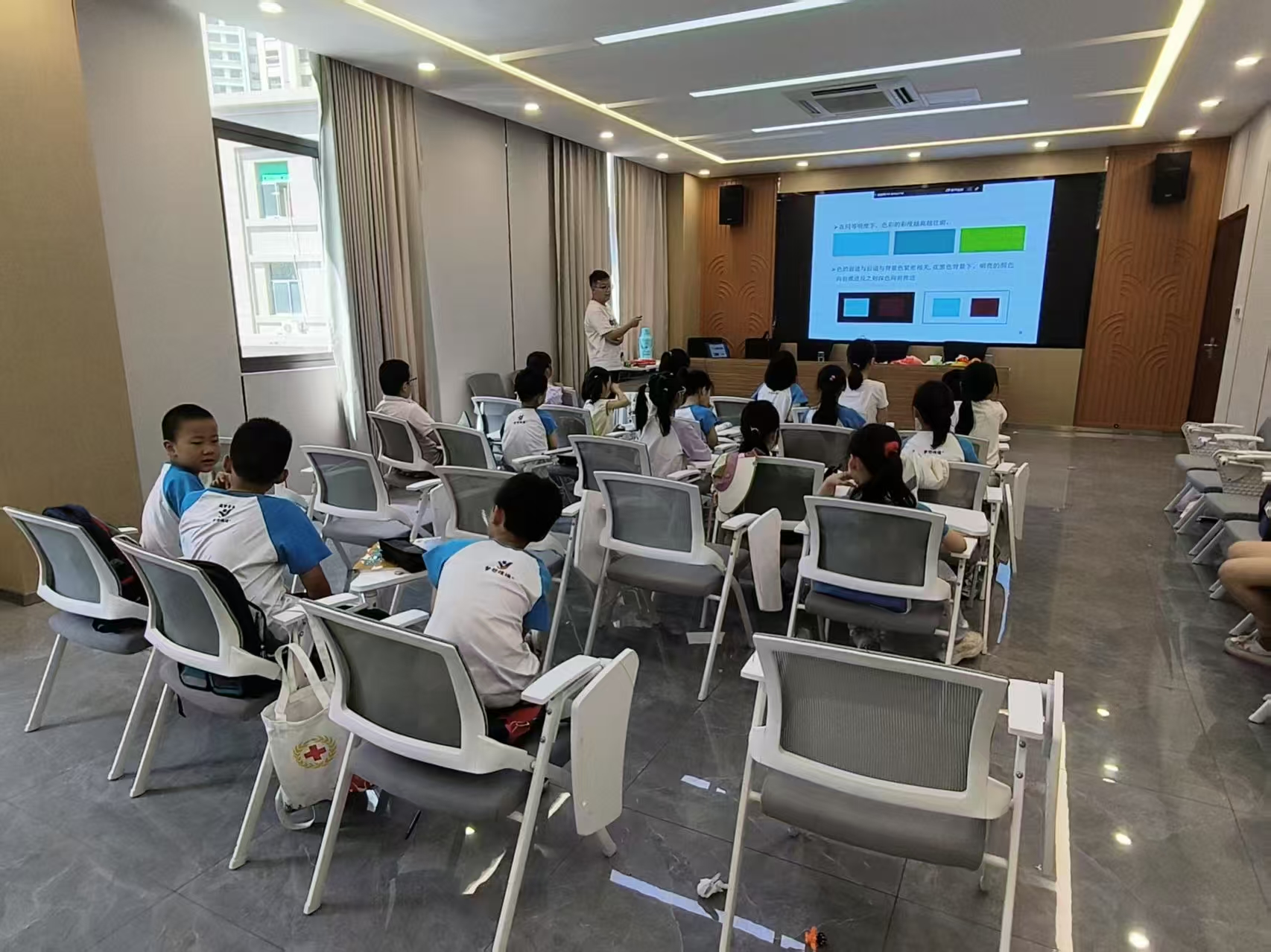 在本次绘画课程中,李振宇同学带着暑托班的学生们了解了色彩的一系列知识。以“色彩构成基础知识”为题开展教学活动。首先他对色彩的三要素进行介绍,确保学生对色彩有一个基本认识。之后他了介绍色彩与情绪的关系,引导学生理解不同颜色所代表的情感内涵。