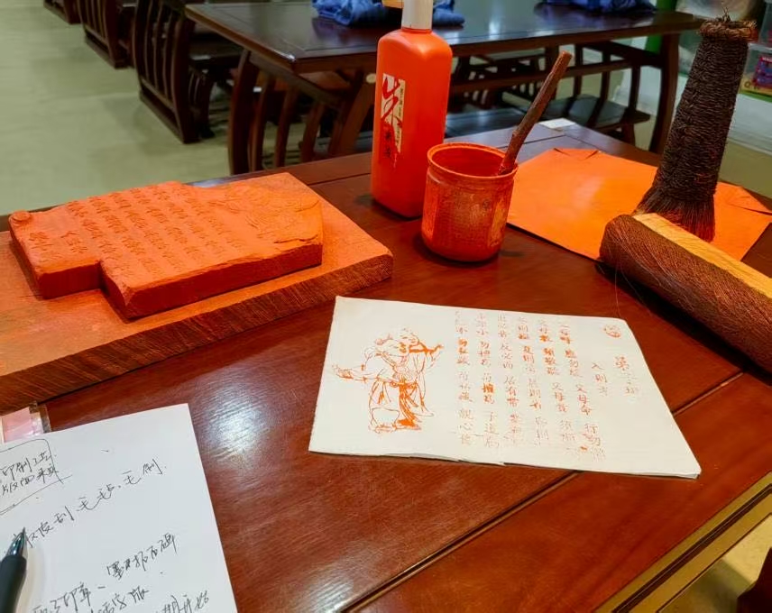 任茹玉同学还创新开发了“雕版印刷+古诗词”研学项目,引导孩子们亲手印制《三字经》《千家诗》选句,在墨色芬芳中触摸文字的温度与历史的厚度。看着孩子们专注的眼神和小手上沾染的墨迹,她相信这颗非遗的种子已在孩子们心田悄然种下。