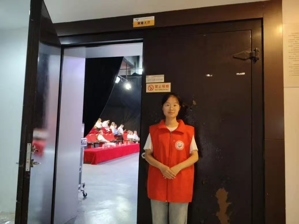 活动筹备阶段,王晶晶便展现出其认真负责的服务态度。她总是早早就到了演播大厅,在为期两天的志愿服务中,她负责资料整理工作以及迎宾和接待的工作,并且以自己独特的见解精准优化服务路径。发现休息室指示牌被绿植遮挡后,她立即协调后勤组调整布局。这种极致追求贯穿始终:签到表一遍遍仔细核对,陪主讲人们一遍遍走台。