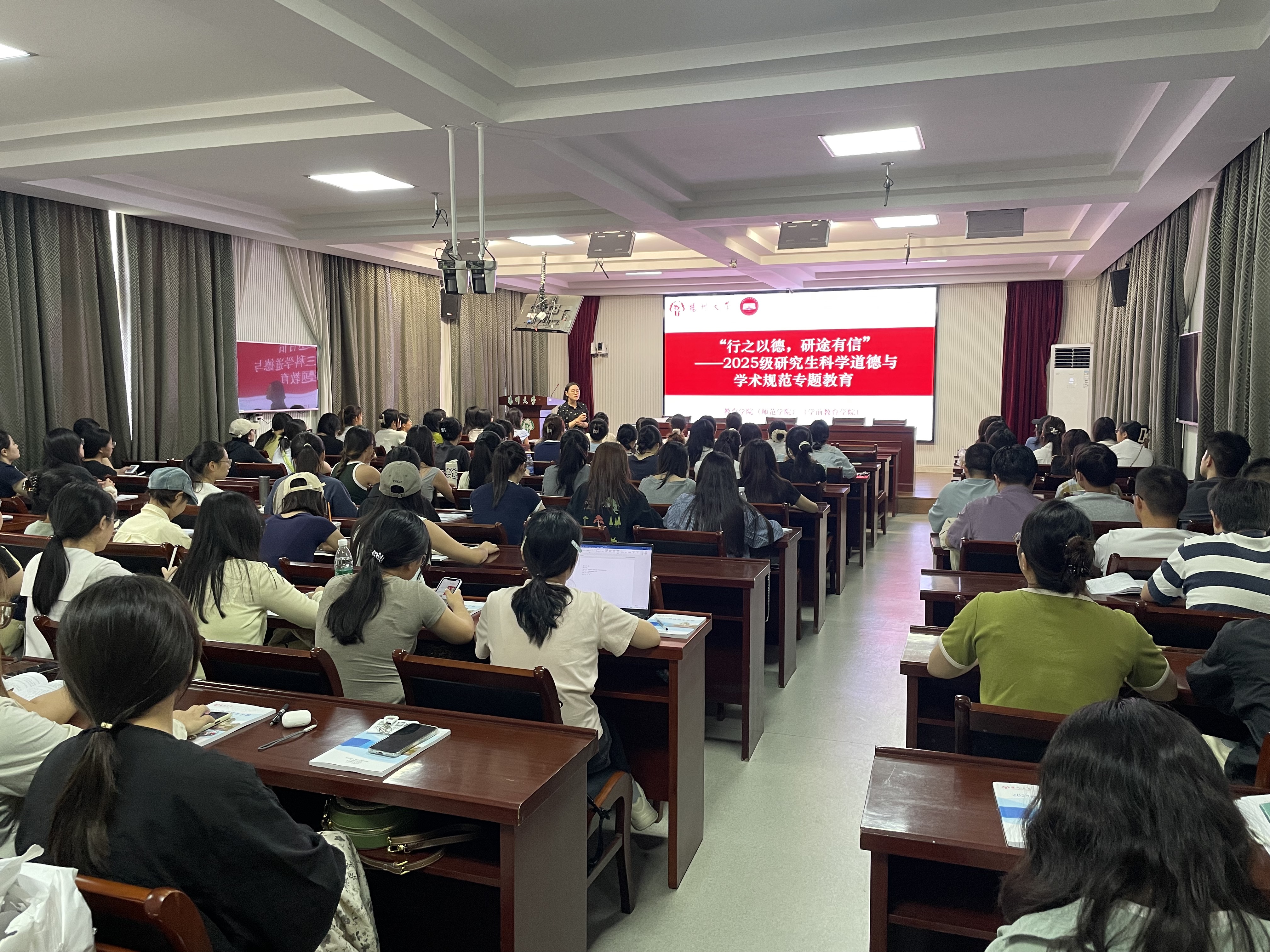 9月9日上午,学院开展“行之以德,研途有信”——2025级研究生科学道德与学术规范专题教育。研究生辅导员从科学道德的重要性、学术不端的具体表现、遵守学术规范的具体做法等方面进行介绍,解读了加强研究生学术规范和提高培养质量的制度文件,向全体研究生发出“弘扬学术道德,抵制学术不端”的倡议。