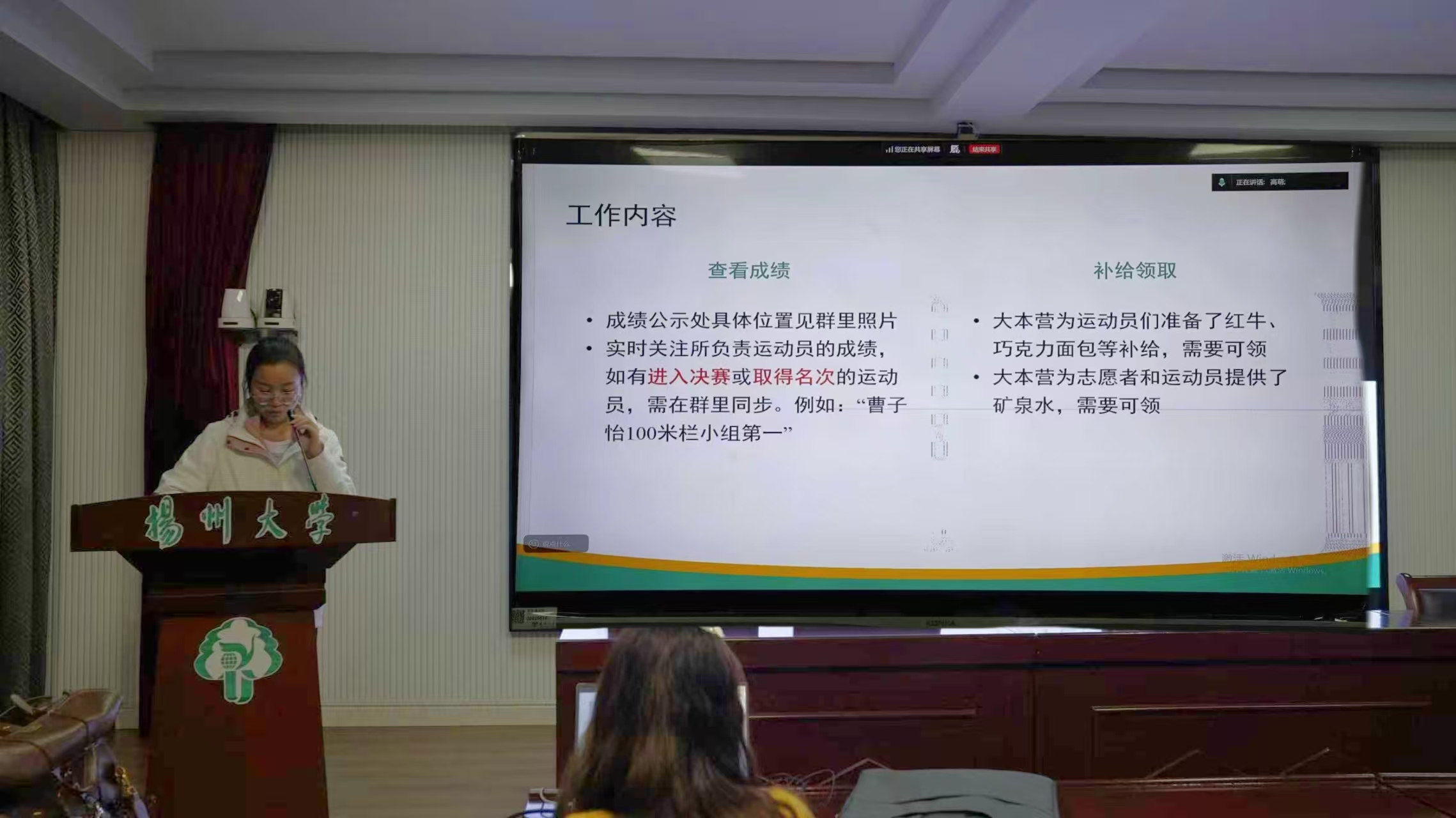 随后,戴文静学姐讲解了志愿者们的主要工作,首先强调安全问题,避免横穿跑道等,志愿者们须提醒运动员检录时间,检查所需证件,实时关注运动员成绩与身体状况,以及应对一些突发情况的必备技能。