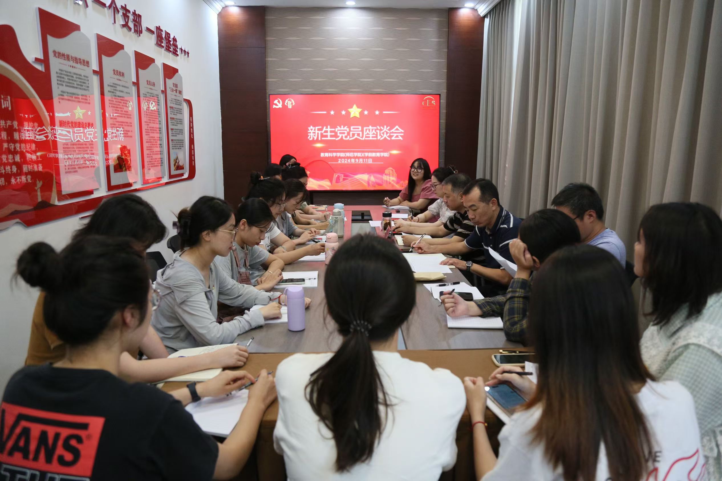 为帮助新生党员尽快融入党组织,强化党员责任意识,推进党员队伍建设,学院于9月11日下午在院党建工作室召开新生党员座谈会。院党委书记杨咏、党委副书记朱鑫铨出席,院综合办公室副主任张洁云、研究生党支部书记李文超、鹿秀颖以及全体新生党员参加。