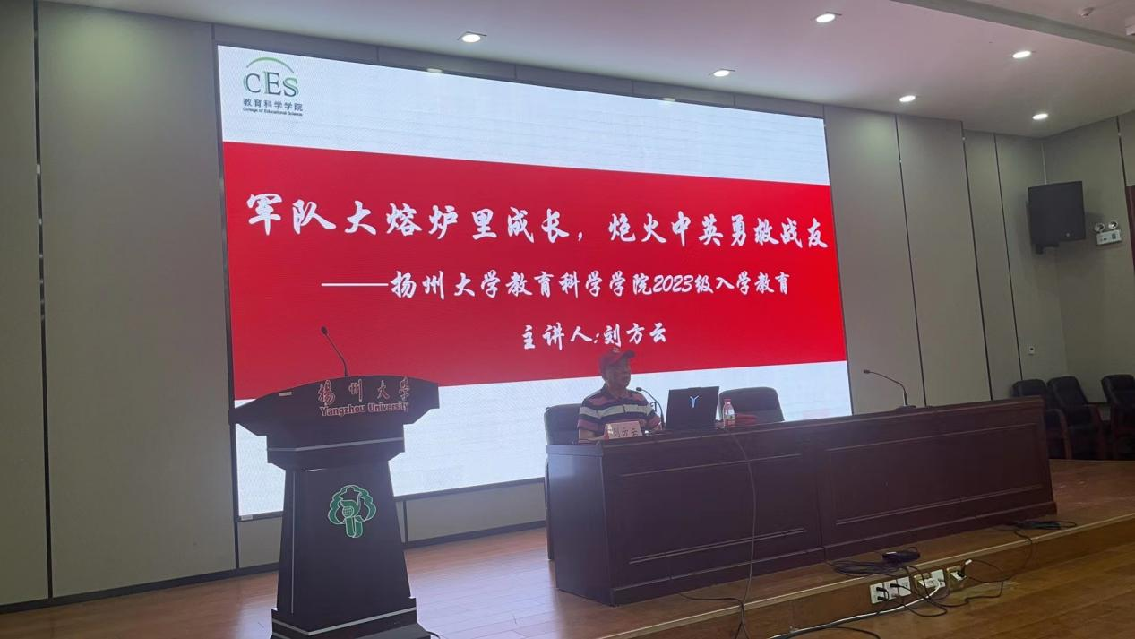 近日,教育科学学院于瘦西湖校区8号楼S405报告厅开展“军队大熔炉里成长,炮火中英勇救战友”新生入学教育专题讲座。校关工委顾问刘方云爷爷担任主讲人,院团委书记孙维主持,2023级全体新生参加。