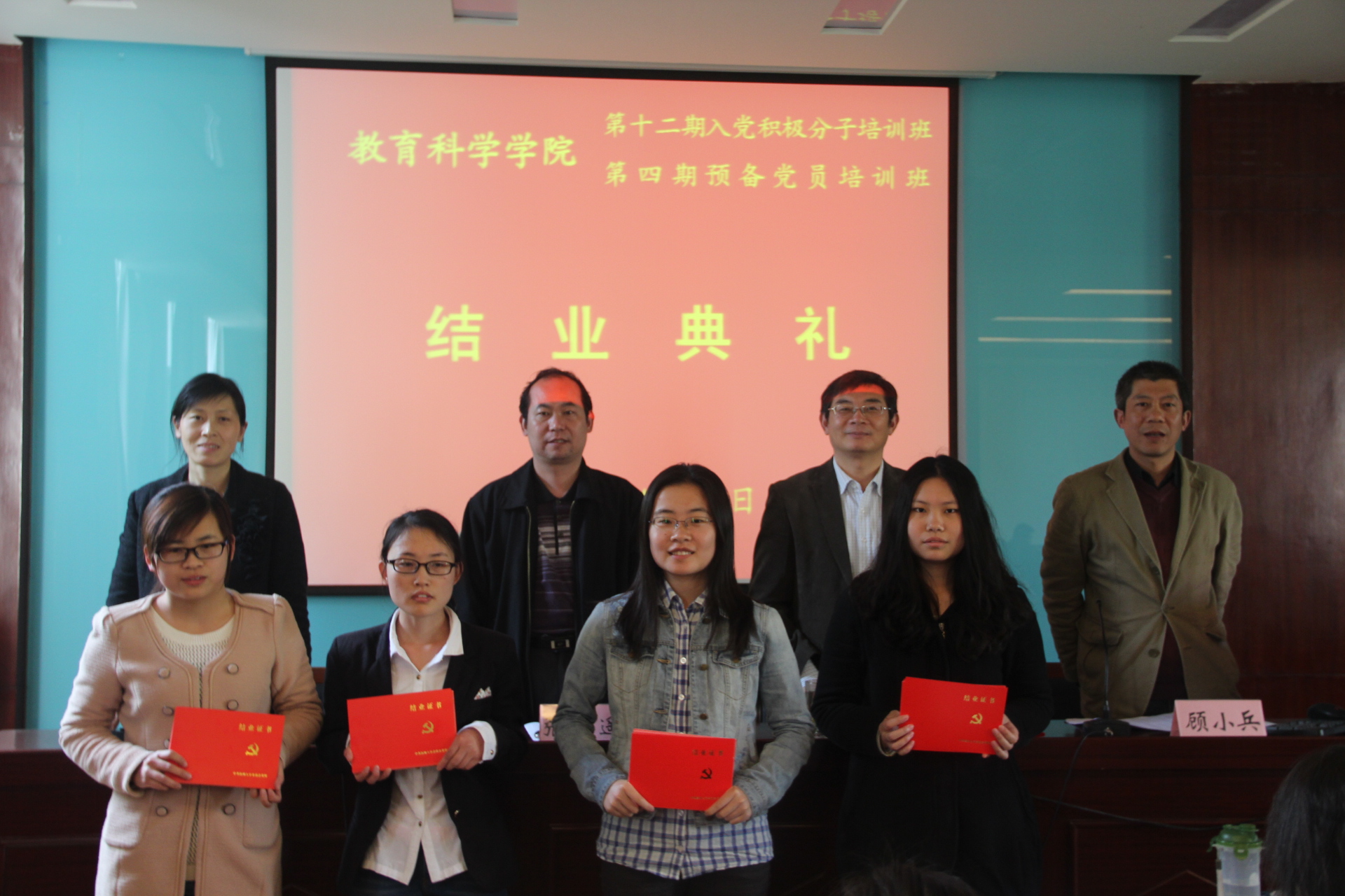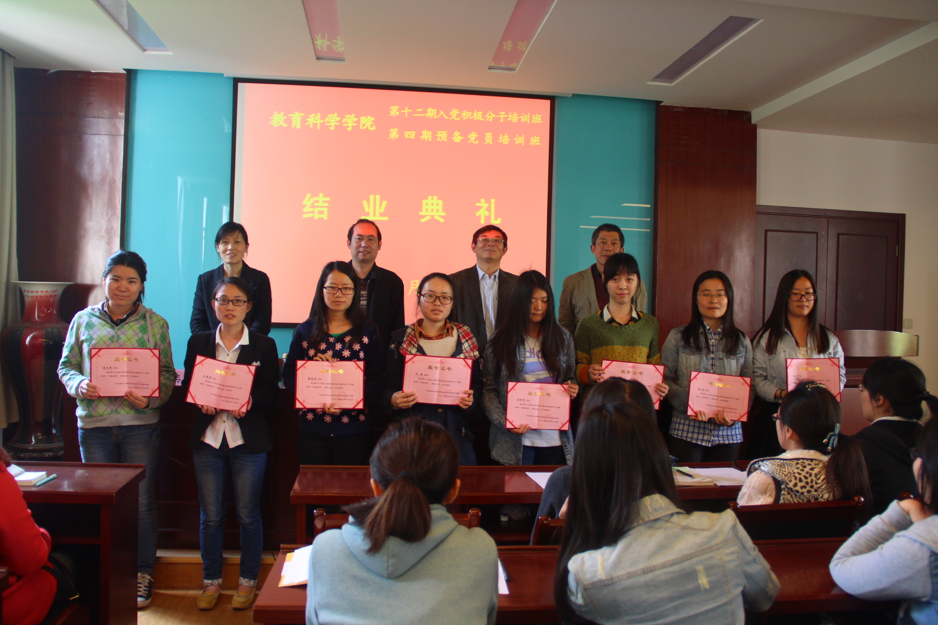 2014年4月23日下午,学院在二楼报告厅举办分党校培训班结业典礼。院党委书记、分党校校长史华楠作了总结讲话,史书记充分肯定了本期培训班所取得的成绩,对培训班学员提出了殷切的希望,希望同学们要结合自身实际,对照党员条件,从严要求自己,努力全面发展。思想上高标准、高起点、高要求,行动上脚踏实地一步一个脚印,以自己的实际行动,接受党组织的考验。会上还对优秀学员进行了表彰。