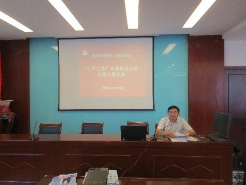 7月10日本学期最后一天,学院召开党员大会,院党委书记史华楠以“践行‘ 三严三实 ’,坚守品格准则,促进事业发展”为题,为全院党员教工讲“三严三实”专题党课。