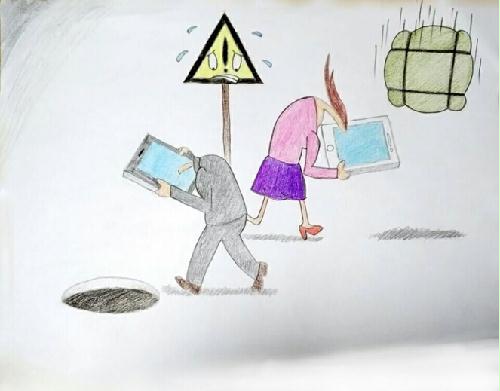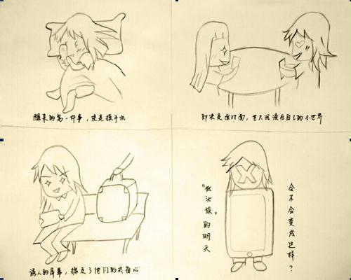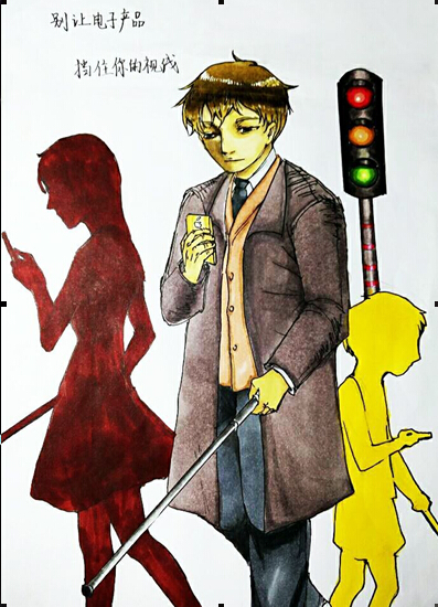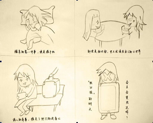 “明明很困却还要玩手机,明明醒了还得要玩半个小时手机再起床;醒来的第一件是就是摸手机,走路都是歪歪扭扭没有方向;即使面对面也只是沉浸在微博、淘宝的世界里,视力不断下降…”令人忍俊不禁的小漫画真实还原了我们的生活,却也令人反思。沈玲惠同学说道:“习惯于被动接受一些碎片式的文化,不知不觉就加入到低头族的行列,反思自己已经有很久没有认真地看一本书了,与朋友在一起也会忙着玩手机。”邹晓怡同学告诉我们:“我看到这边的作品中还有一幅治疗低头族后遗症的简单方法,图文并茂,很有趣,感觉很是贴心。”