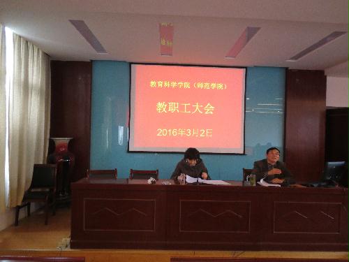 3月2日下午,学院新学期教职工大会在院二楼报告厅举行。院党委书记史华楠主持会议并传达学校有关会议精神,通报班子民主生活会情况。院长陈秋苹代表学院党政回顾总结了2015年度学院主要工作,重点部署了2016年党政工作要点。副院长查永军通报本科教学审核评估整改落实情况和学校教学院长会议有关精神。