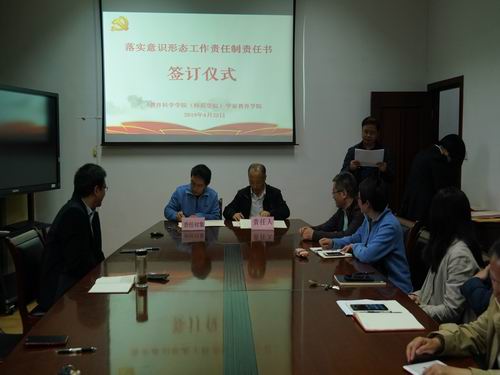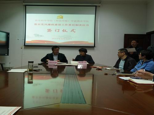 2019年4月23日,教育科学学院举行落实党风廉政建设工作责任制、意识形态工作责任制以及校园安全综合治理工作责任制责任书签订仪式,全体院领导分别与分管责任对象签订了有关责任书。