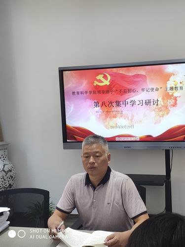 9月29日上午,教育科学学院领导班子举行“不忘初心、牢记使命”主题教育第八次集中学习,围绕“坚持以师生为中心”进行专题学习。院党委书记胡学春主持,院党委委员,副院长朱拥军带领大家认真学习了《习近平关于“不忘初心、牢记使命”重要论述选编》中“做焦裕禄式的县委书记”、“弘扬伟大长征精神,走好今天的长征路”等2篇重要论述。