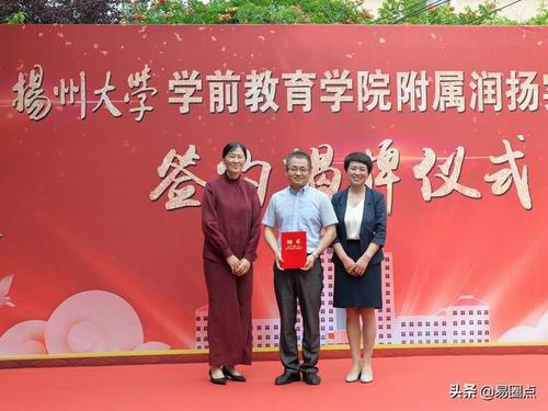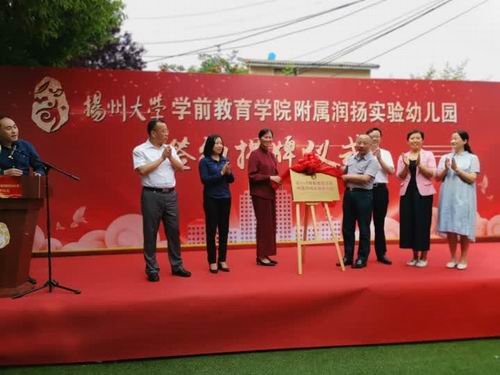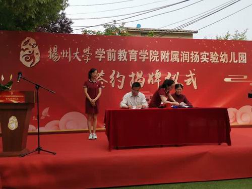 学前教育学院与蒋王幼儿园合作举办扬州大学学前教育学院附属润扬实验幼儿园签约暨揭牌仪式于5月31日下午举行。校党委常委、副校长陈亚平、社会合作处负责人张丹、全体院领导、邗江区教育局党委书记、局长何云峰,党委副书记吴岚以及邗江区蒋王街道办事处主任吴军等参加了活动。邗江区教育局副局长冯长宏主持签约揭牌仪式。