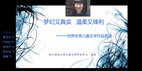 6月29日上午,著名童话作家、中国作家协会会员、浙江省作家协会副主席、浙江省全民阅读形象代言人、浙江师范大学特聘教授汤汤老师做客教育科学学院,通过钉钉直播的形式,在线上为全院师生带来了题为《梦幻又真实、温柔又锋利——世界优秀儿童文学作品赏读》的讲座,210余人参与了讲座。
