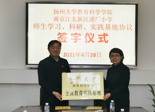 随后,全体成员赴浦厂小学参观。该校创立于1918年,以王荷波精神为办学指引,校园建设融合了中国火车事业的发展特色。学院代表与浦厂小学校长分别签订了“扬州大学教育科学学院卓越小学教师培养合作学校”“扬州大学教育科学学院生涯教育实践基地”的协议,双方将在师生学习、科研、实践等方面进行深度合作。