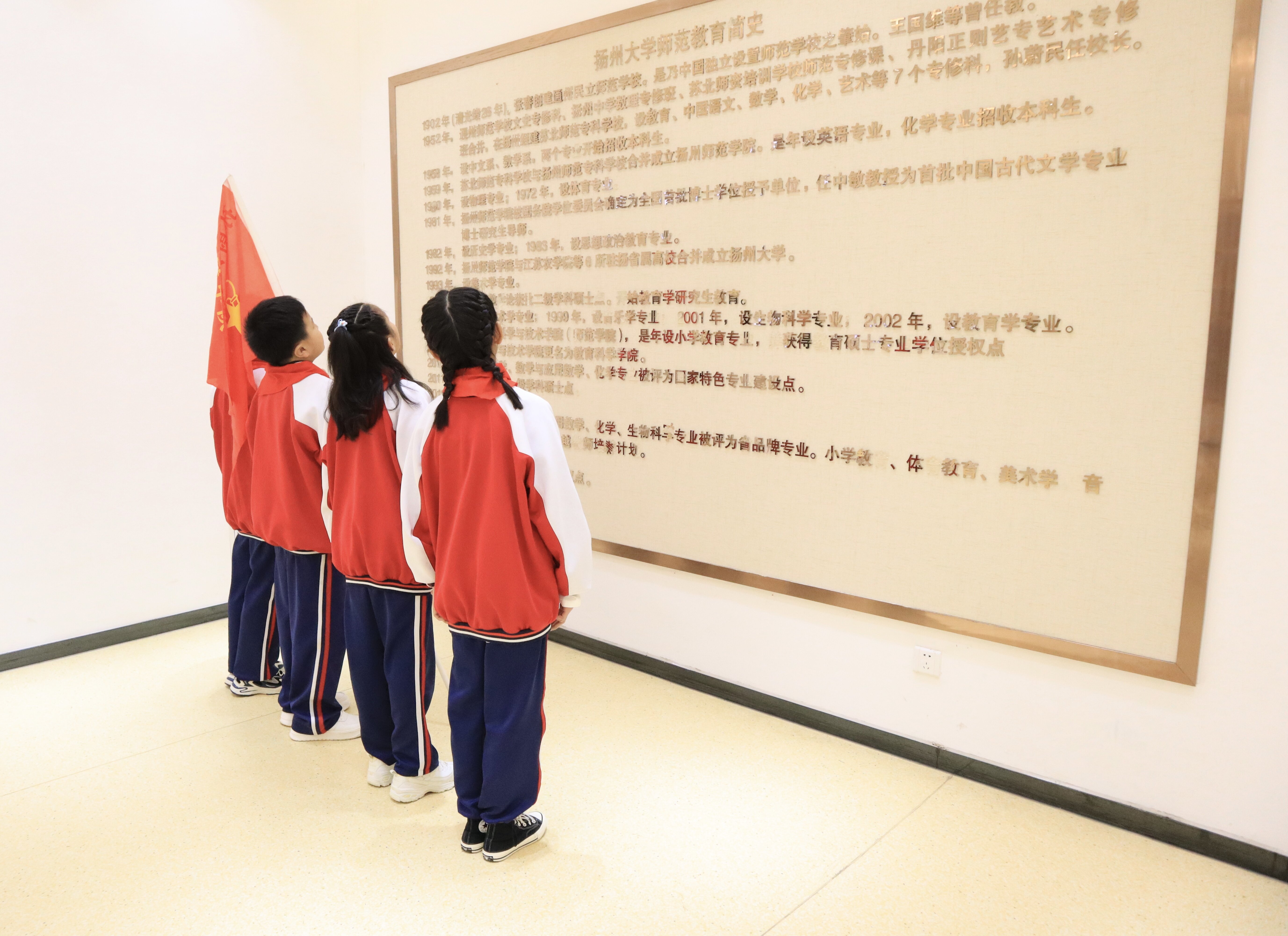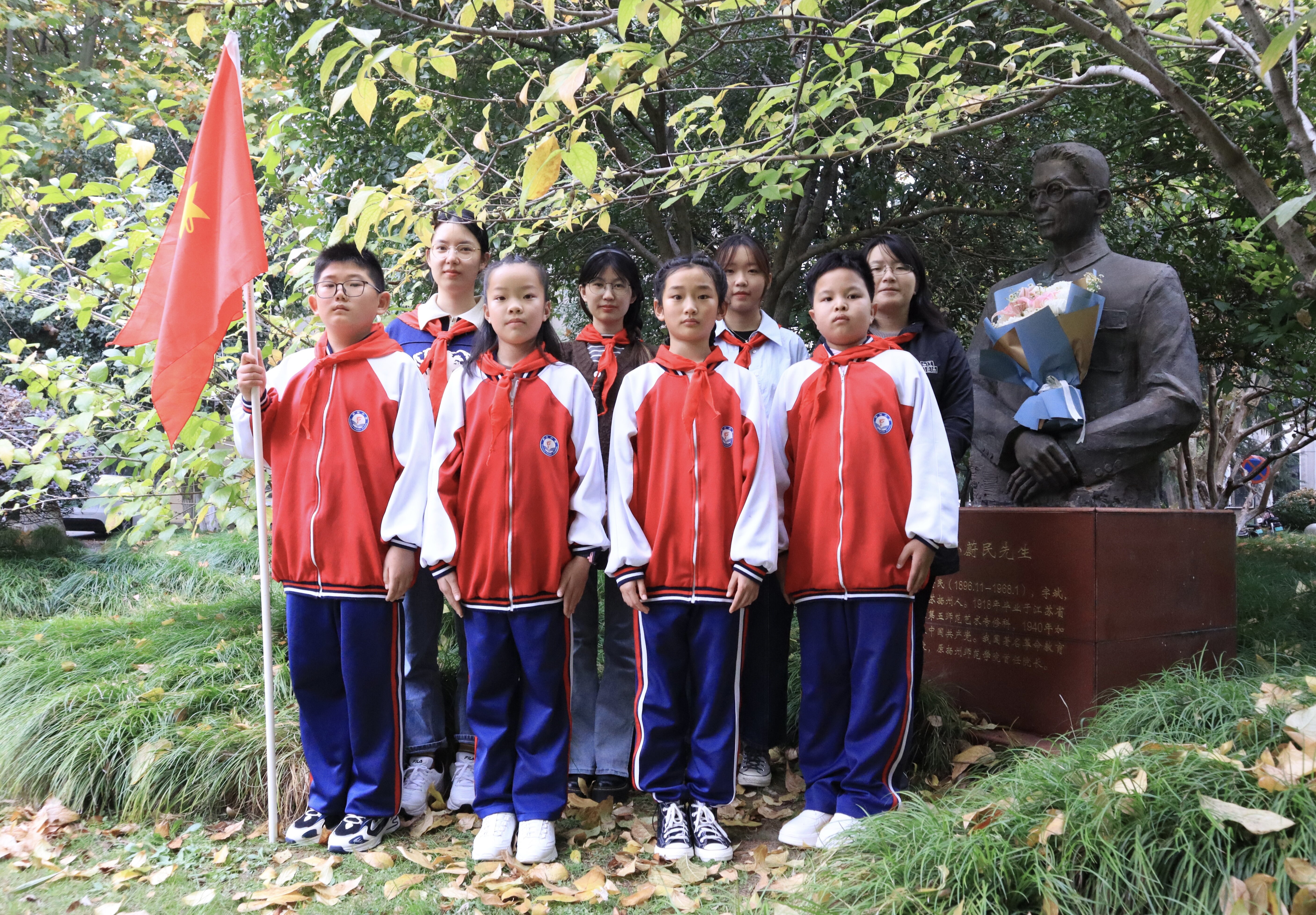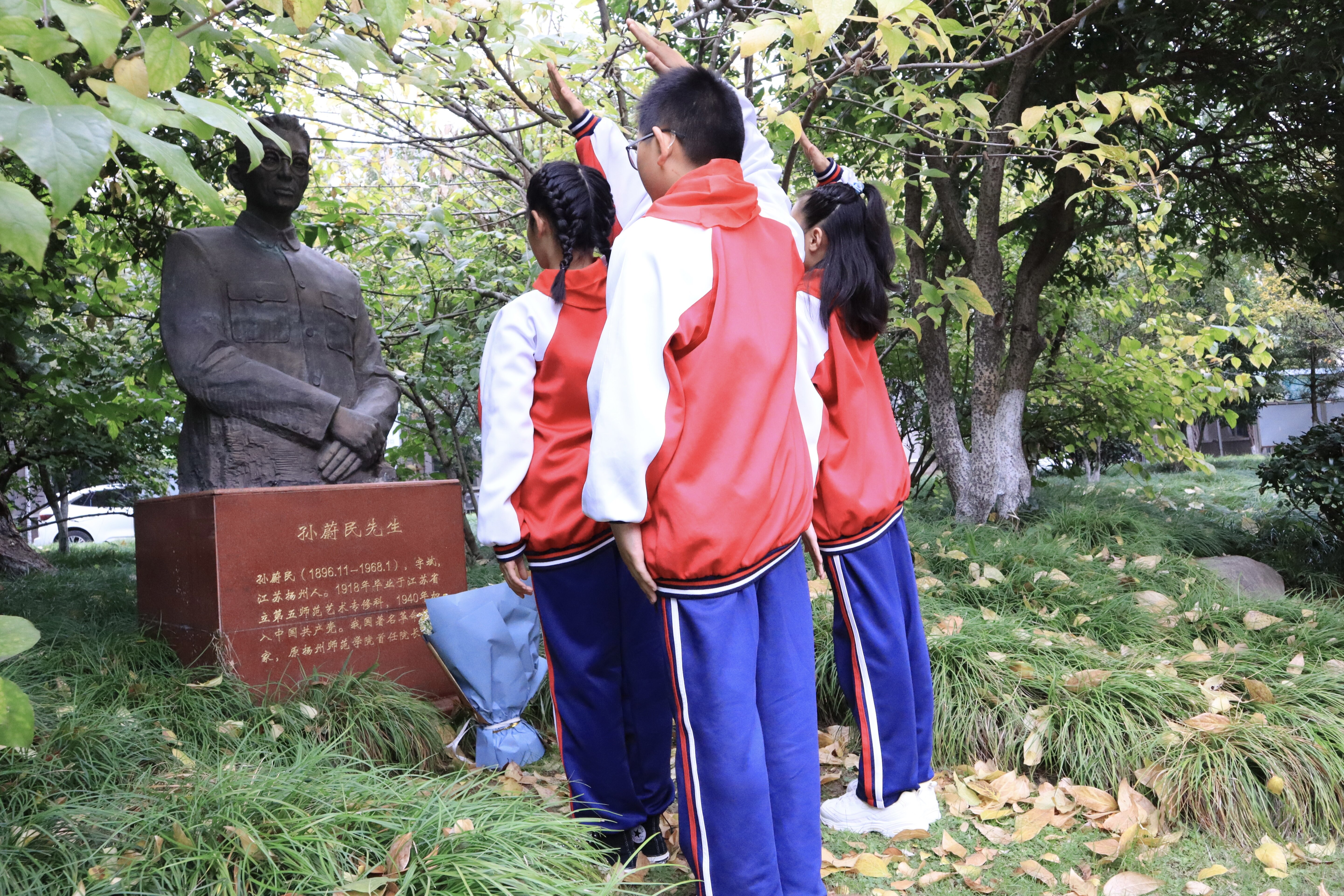 秋风吹拂,红旗飘扬。扬大孙蔚民班的同学们与郭村小学师生一同来到先生的铜像前,瞻仰先生的风范,亲身体会“教育为民、无私为公”的蔚民精神。只见孙蔚民铜像身材颀长,脸颊清癯,戴一副金丝眼镜,展现了爱党爱国、鞠躬尽瘁的师者形象。孙蔚民班的班长赵烨彤深情地讲述了孙蔚民先生的事迹:“孙蔚民先生是伟大的教育家,一生先后主持创办了十所院校,1940年担任郭村小学校长时加入中国共产党,携全家投身于革命之中。为中国革命和教育事业做出了重要贡献,付出了毕生精力。这座位于扬州大学瘦西湖校区里的铜像是在扬州大学建校110周年时所立,以纪念孙蔚民先生对扬州地区教育事业作出的卓越贡献。”令人深受触动。