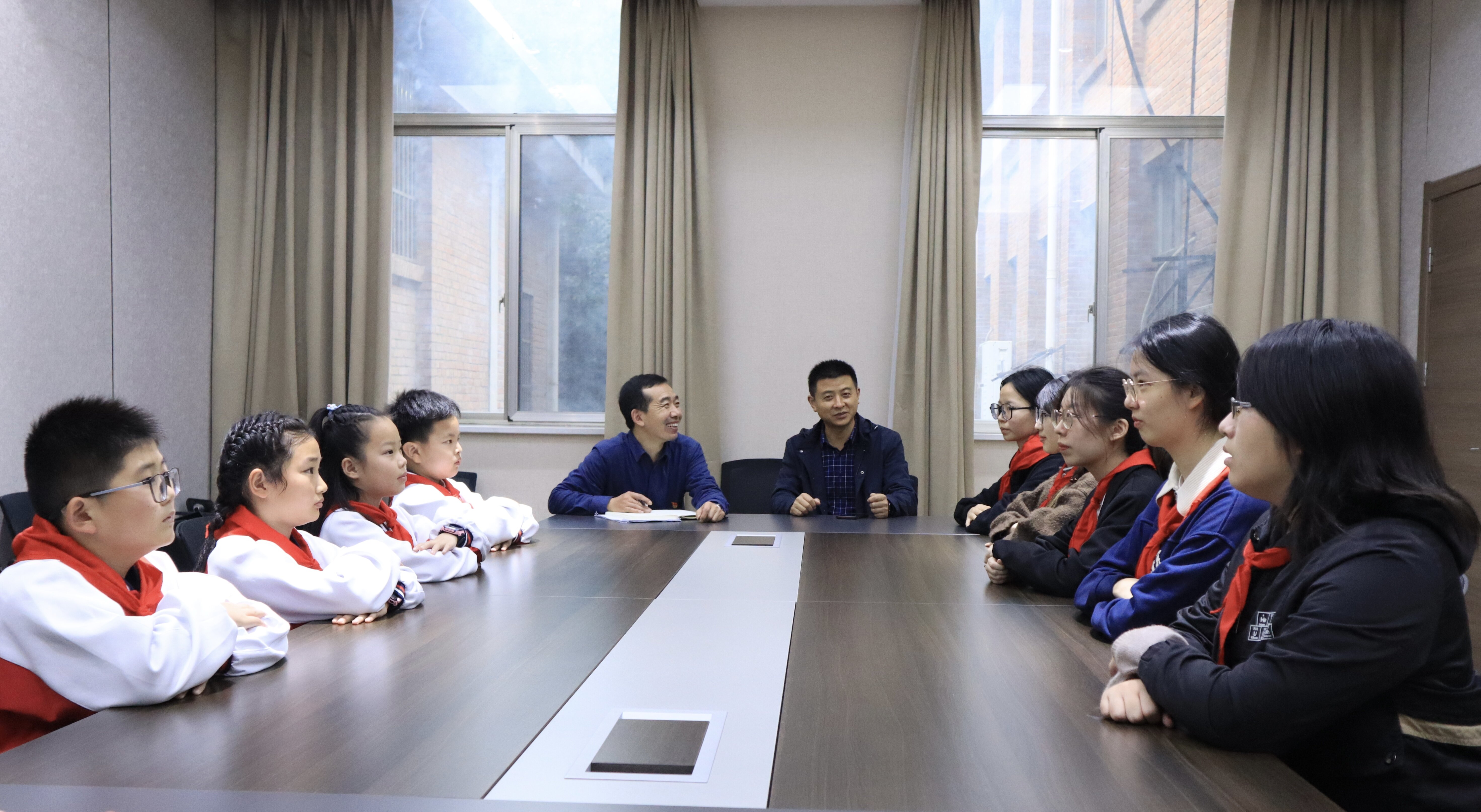 “郭村小学主干道上有一座孙蔚民先生的铜像,扬州大学仰师亭旁也有一座铜像,这两者有什么联系吗?”来自郭村小学的曹超同学问道。只见铜像身姿挺拔、目光坚毅,生动地再现孙蔚民先生教育大家及革命斗士之形象。孙蔚民班的周玥同学笑着答道:“孙蔚民先生曾担任郭村小学的校长,同时也是扬州师范学院创校人,从事教育工作五十余载。这两座铜像表现了两校深厚的渊源,也象征着后辈对先生伟大精神的一脉相承。”
