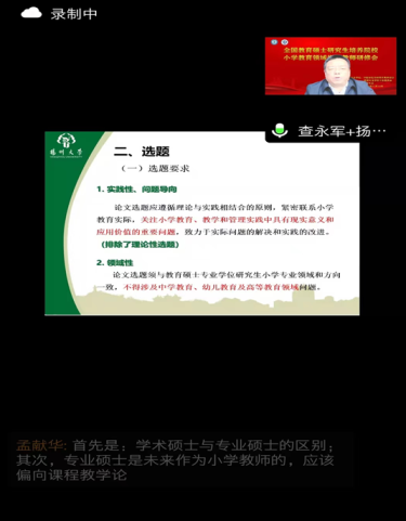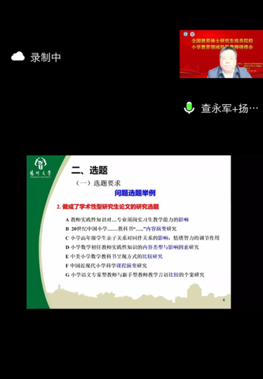 本次会议主要聚焦于“如何有效提高教育专业硕士学位论文质量”这一主题,围绕工作委员会《教育硕士专业学位论文基本要求》进行专家解读;分析小学教育领域论文选题的特点,以及在撰写、抽检、优秀论文评审等环节的指导要求;邀请部分高校就学位论文指导进行经验分享交流。由于扬州大学小学教育专业硕士培养工作的卓越成效,我院查永军院长受邀为来自全国的指导教师做题为《小教专硕学位论文选题及撰写交流-基于论文抽检与评审》专题讲座,讲座通过大量的实例,就小教专硕论文的格式、选题、撰写、常见问题、可能原因等话题逐一展开,共享我院多年积累的学生论文指导经验,引起了与会指导教师们的热烈讨论,有效回答了大家普遍关心的选题、研究方法等问题,受到了大家的广泛好评,为大家准确把握《教育硕士专业学位论文基本要求》中的丰富内涵和精神实质提供了非常有益的启示。