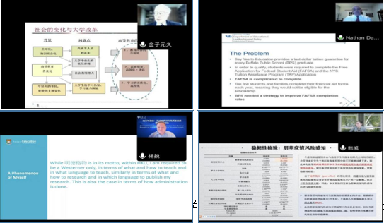上午主旨演讲环节,日本高等教育学会前会长、东京大学名誉教授、筑波大学金子元久教授的报告主题为《学生の変化と大学教育》,纽约州立大学布法罗分校Nathan J. Daun-Barnett教授的报告主题为《Improving College Affordability – University Community Collaborations for Postsecondary Opportunity》,香港大学教育学院院长杨锐教授的报告主题为《当代教育国际性和民族性的统一》,北京大学教育学院鲍威教授的报告主题为《调适与脱轨:新冠疫情对高校学生生涯发展路径的冲击》,扬州大学教育科学学院潘洪建教授的报告主题为《国际小学科学课程目标:共同趋势与问题讨论》,华东师范大学教育学部徐国兴教授的报告主题为《我国拔尖人才培养政策转型背后的理念变化:回顾与前瞻》,韩国中源大学全春莲教授的报告主题为《대학 핵심역량 및 진단도구 개발과 적용(大学核心能力及测评研究)》。