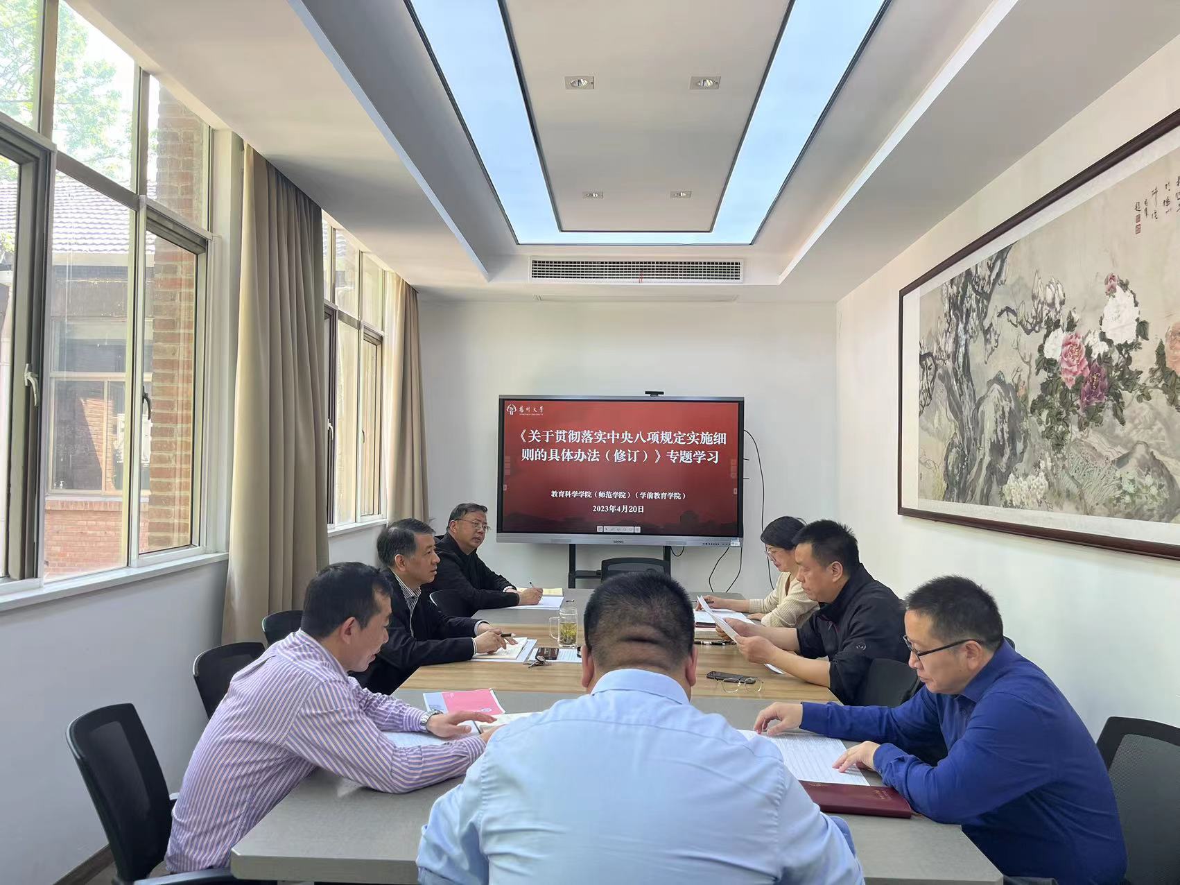 4月20日,教育科学学院党委召开会议,专题学习中共扬州大学委员会《关于贯彻落实中央八项规定实施细则的具体办法(修订)》文件精神,党委书记杨咏书记主持会议并领学,院党政领导班子成员、综合办办公室、团委(学工办)负责同志参加学习。
