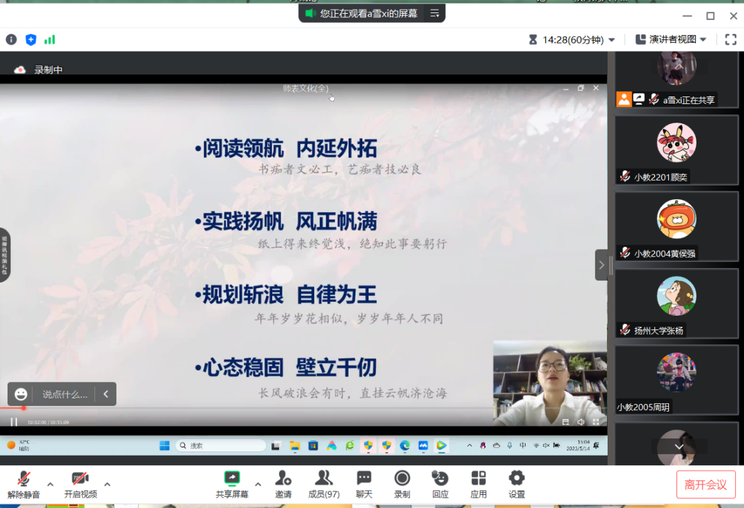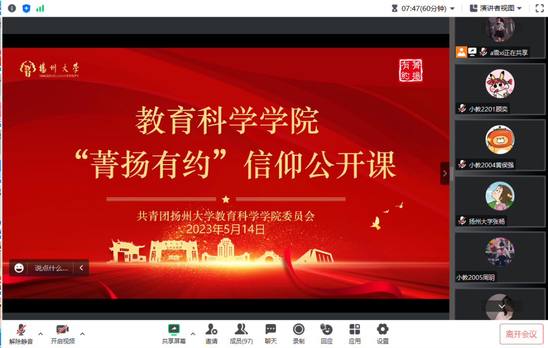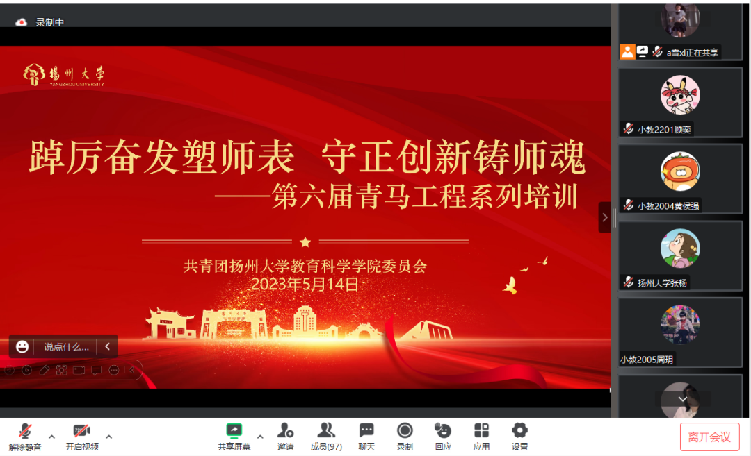 为深入推进大学生的学涯教育,引导同学们进一步明晰对未来的规划,近日,扬州大学教育科学学院(师范学院)(学前教育学院)开展“菁扬有约”信仰公开课,邀请我院优秀毕业生常熟理工学院团委书记吕玉作主讲人,召开“以奋斗之姿,赴青春之约”为主题的线上经验分享会。青马工程全体学员参会,杨雪和辅导员张杨老师担任本次分享会的主持人。