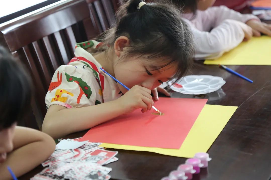 “早期中国共产党党徽和现在的党徽有什么区别呢?”志愿用互动问答的形式,带领小朋友了解党徽形态的历史发展演变。在创作党徽拼贴画环节中,孩子们把水粉颜料调制成金黄和正红的颜色,在纸上绘制心中的党徽。他们握住画笔,一笔一画间满是稚嫩的痕迹,尽管歪歪扭扭,粗细不一,但心中对共产党的崇敬和向往,对国家最纯洁真诚的爱让笔下的党徽愈显珍贵。团队成员蹲在孩子们身旁,帮助孩子们修缮作品,在纸上渲染开明艳的红与黄,每一笔都落得谨慎,每一个细节都经过深思熟虑。此刻,团队成员和社区小朋友们爱党爱国的心紧密联结,汇成了指尖的力量,施加在画纸上,化无形的爱国之心为有形的党徽图案,在阳光下熠熠生辉。