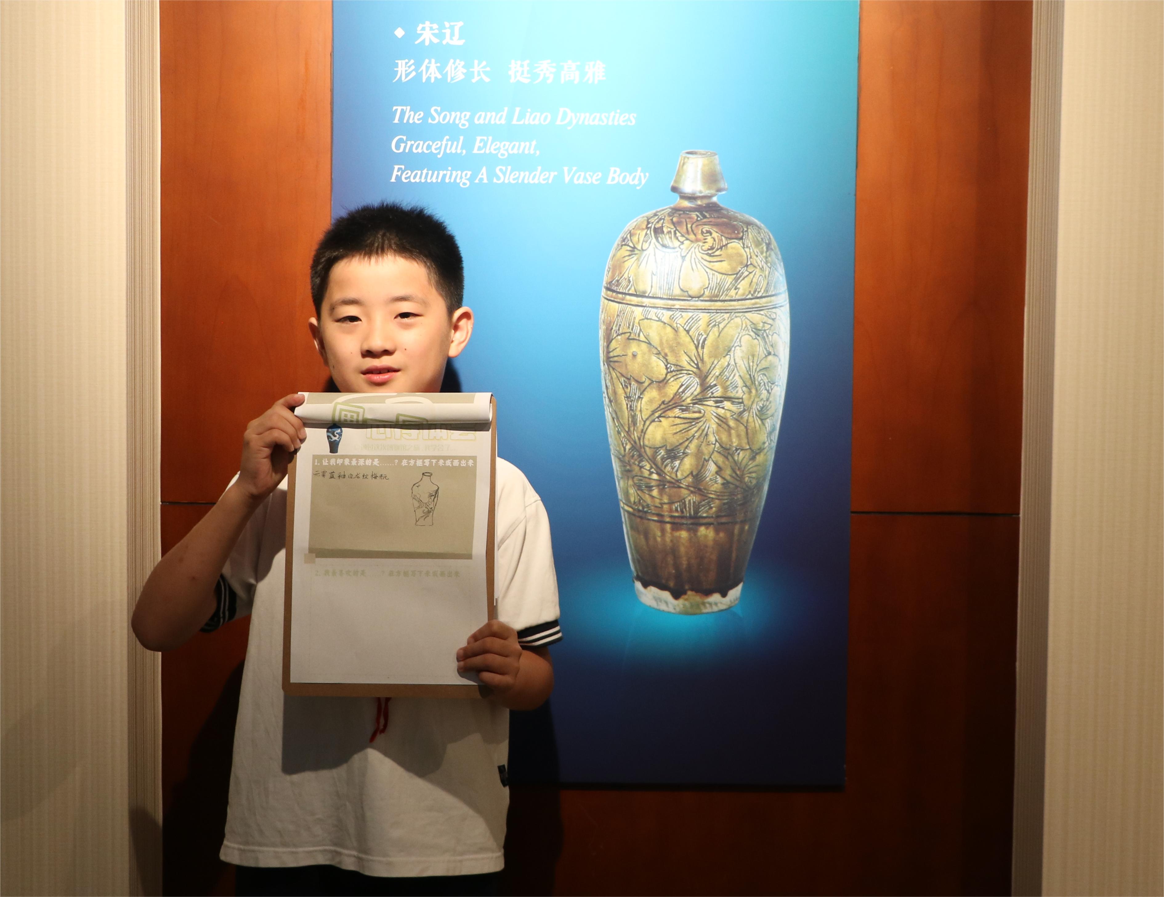 “回溯扬州历史,自春秋建城,至隋唐最盛……”宣讲团成员尹然同学正在广陵潮的展厅前绘声绘色地讲解扬州城的千年风韵,搭配妙趣横生的研学手册,小朋友们不住地点头,用心体悟着历史文物背后的“千古一帆”扬州路。观赏霁蓝釉梅瓶时,小朋友在团队成员的指导下隔空画起了眼前的梅瓶,一笔一划,融入的是对历史文物的敬畏之心,勾勒出的是扬州灿烂的历史文化。写板、校正、上板、雕刻、印刷……了解到雕版印刷的复杂工艺,小朋友们忍不住感叹,坚定了文物保护的决心。