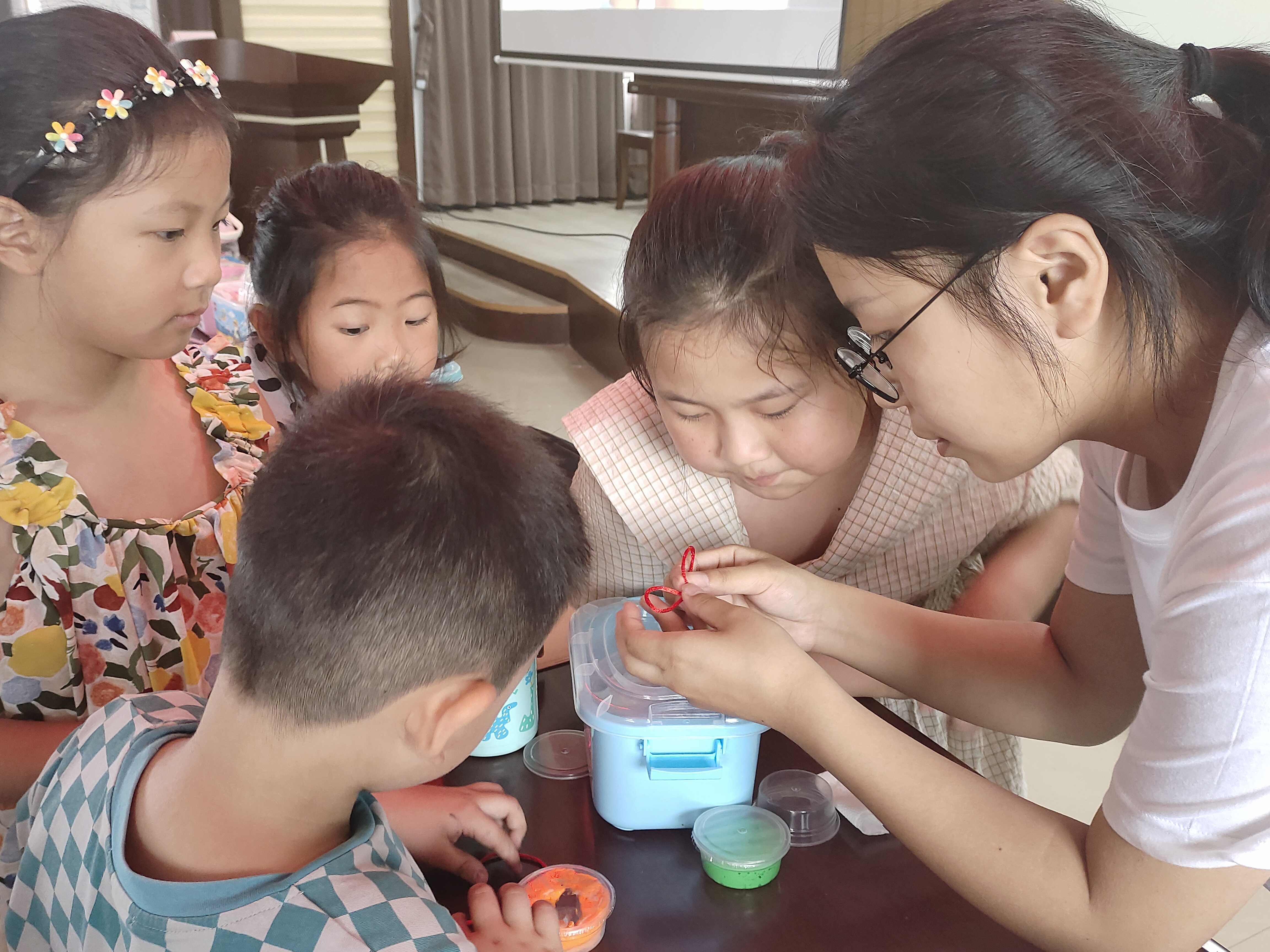 志愿者带领孩子们欣赏唐装旗袍上的盘扣之美,向他们介绍盘扣的造型花样及文化内涵,并通过古今盘扣制作手法异同的对比,激发孩子们对于盘扣学习和制作的兴趣。视频中,经过打孔、雕刻、抛光、组装等多个复杂的工序,一个个栩栩如生的盘扣图案映入眼帘。小朋友们伸着小脑袋看着,惊奇又跃跃欲试。通过视频、图片的学习和志愿者老师的耐心帮助,小朋友们也将手中五彩的编织线变成了一对对漂亮的盘扣。