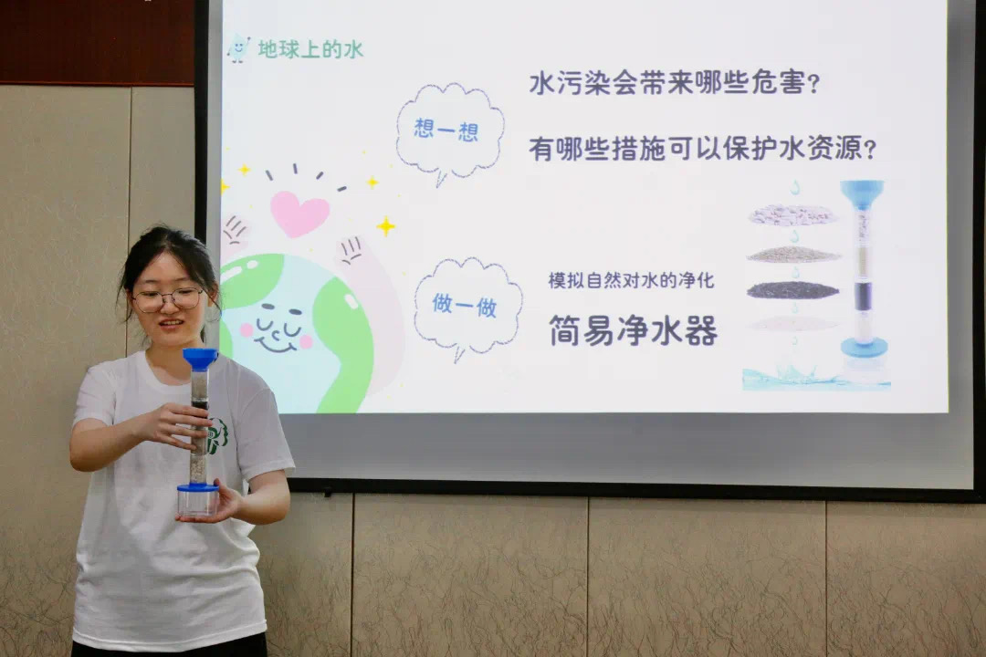 在环保小课堂上,志愿者老师向孩子们介绍关于“水”的知识,重点讲解水对于人体的重要性与水的循环使用。“经过这个过滤装置污水真的能变干净吗?”孩子们目不转睛地盯着面前小装置,神情专注。片刻后,一滴滴清澈的水流入烧杯,教室里陆续响起惊喜的呼声,小朋友们随即展开热烈的讨论。团队成员通过为孩子们讲解基本的净水原理,利用简易材料包制作净水器并观察过滤效果,进一步了解污水再利用的过程,引导青少年树立“环保再生,废物利用”的生态文明理念。
