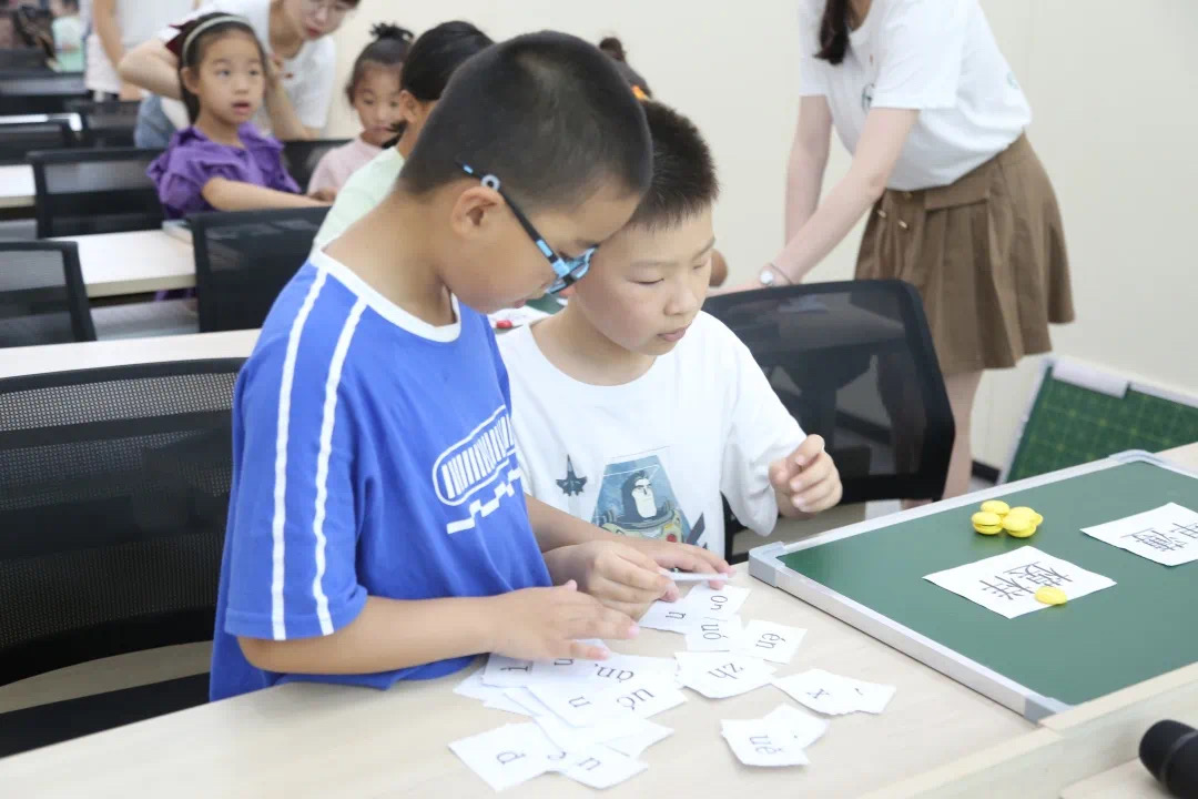 除了读准字音,区分多音字和正确拼写多音字也是说好普通话的关键。为此,志愿者组织小朋友们两两一组,完成屏幕上的多音字拼音练习,在实践中提升对多音字的认识。