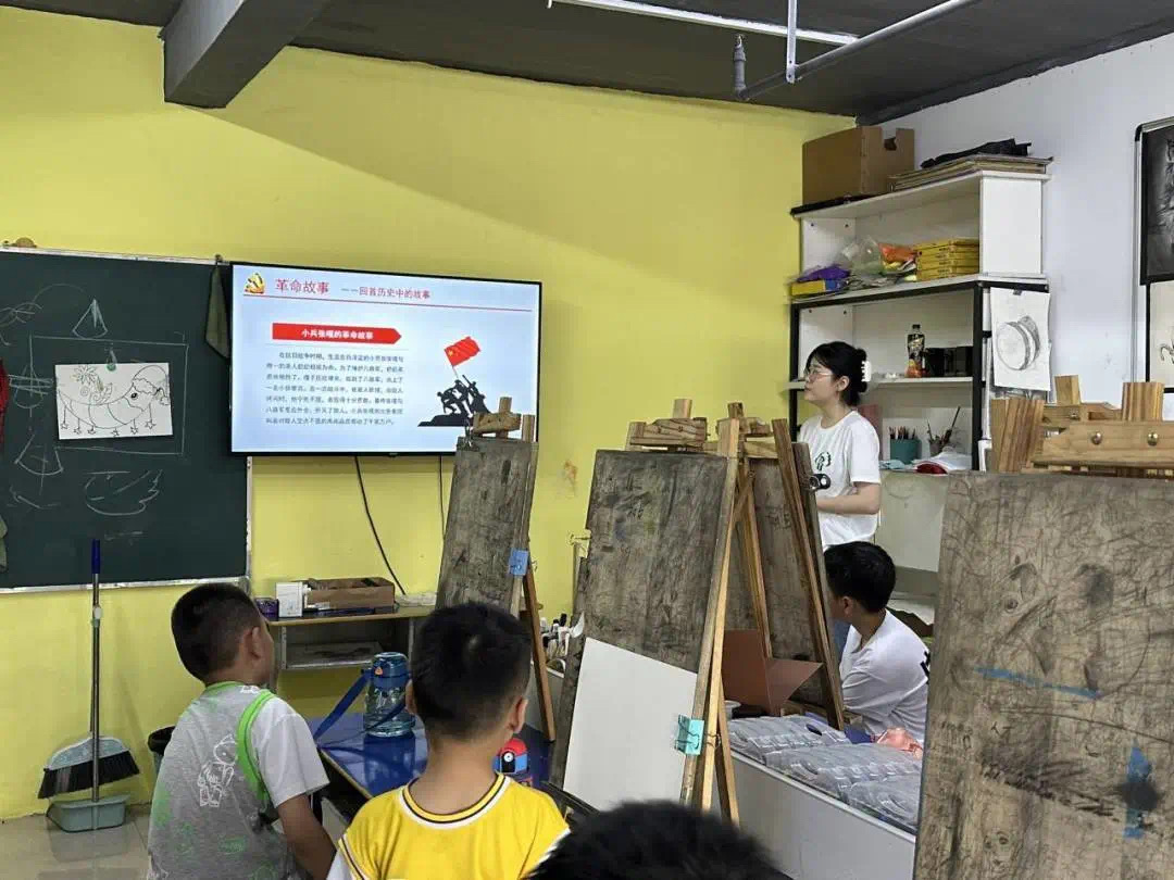 “红星闪闪放光彩,红星灿灿暖胸怀……”随着激昂奋进的旋律升起,小朋友们齐唱《红星闪闪》一曲,雄赳赳气昂昂跟着歌曲节奏律动。红言课上,团队成员在歌声中带领孩子们深情宣誓,高高举起的小手,炯炯有神的目光,昂扬向上的面貌,无不体现出小朋友们对祖国的热爱和对课堂的认真。在团队成员生动的讲解下,小朋友们一步步走近小兵张嘎、朱德等革命战士,仿若身临其境地参观了多处革命圣地。在志愿者的带领下,小朋友们发挥自己的想象力和创造力,用画笔描摹先辈的光辉,用内心感受历史的温度,绘制出一幅幅精美的“童心向党”主题绘画。